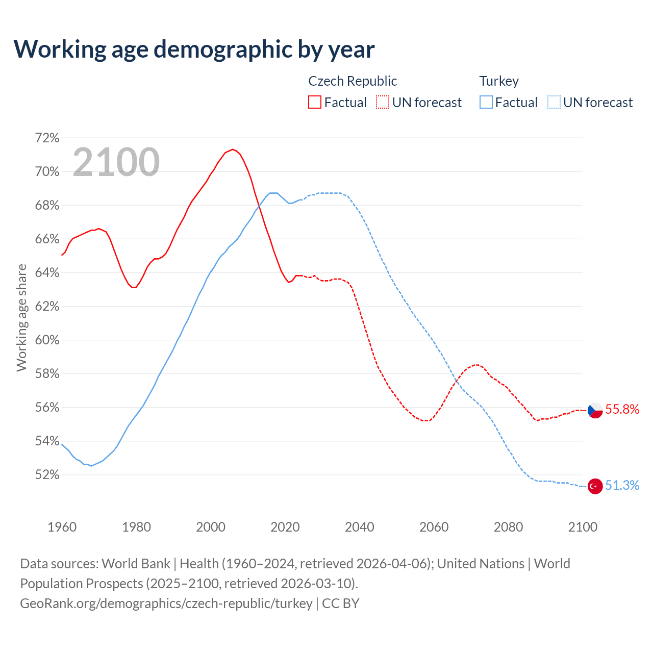 - The Czech Republic has 6.79M working age adults (aged 15-64) vs 58.7M in Turkey.