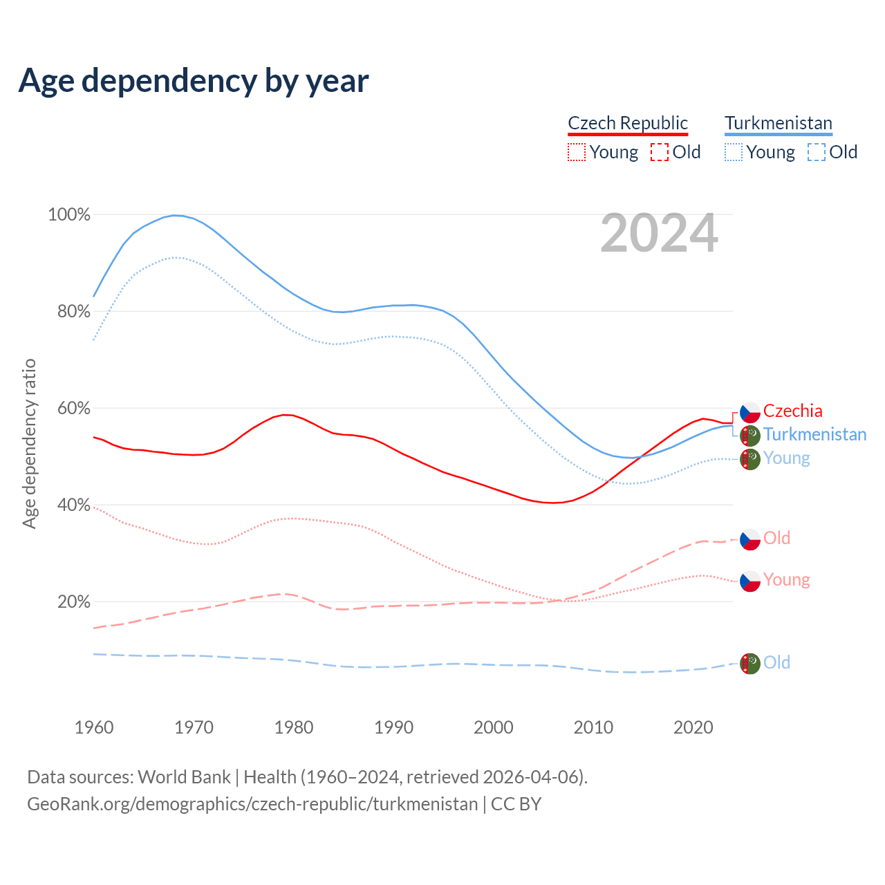 - The Czech Republic is ranked 21/196 by median age (oldest to youngest) vs 119/196 for Turkmenistan.