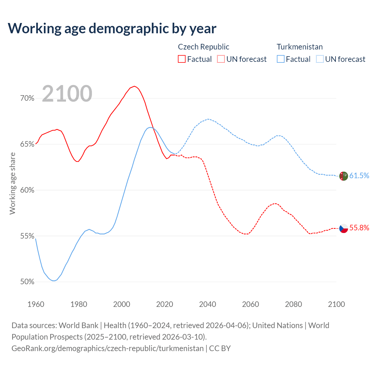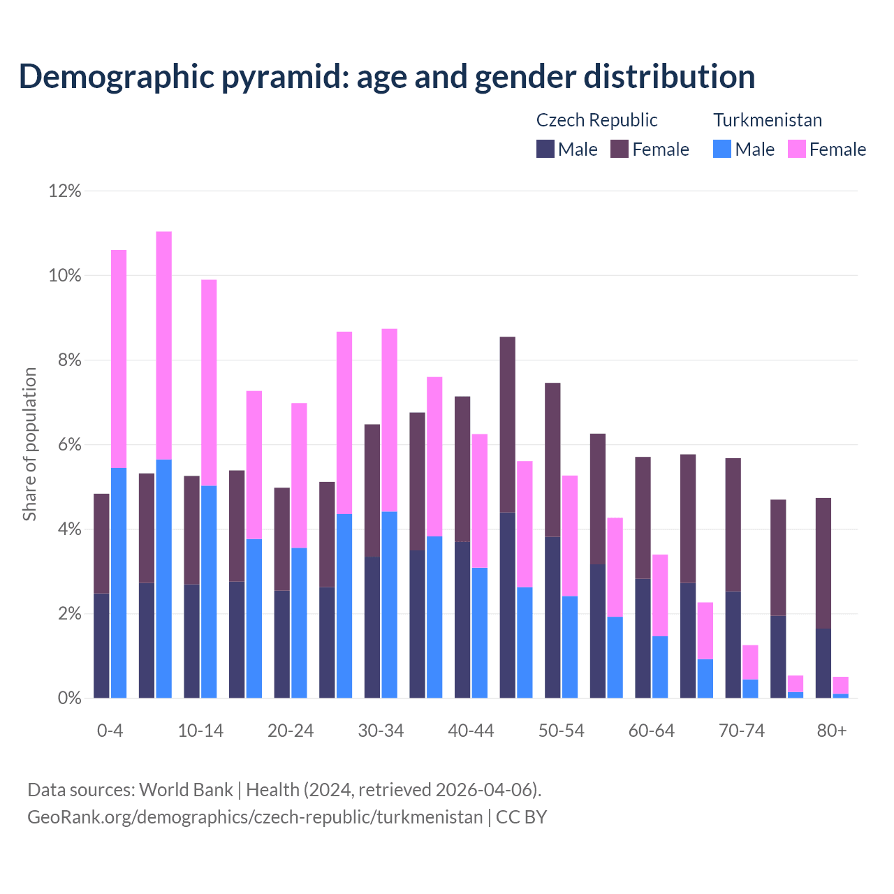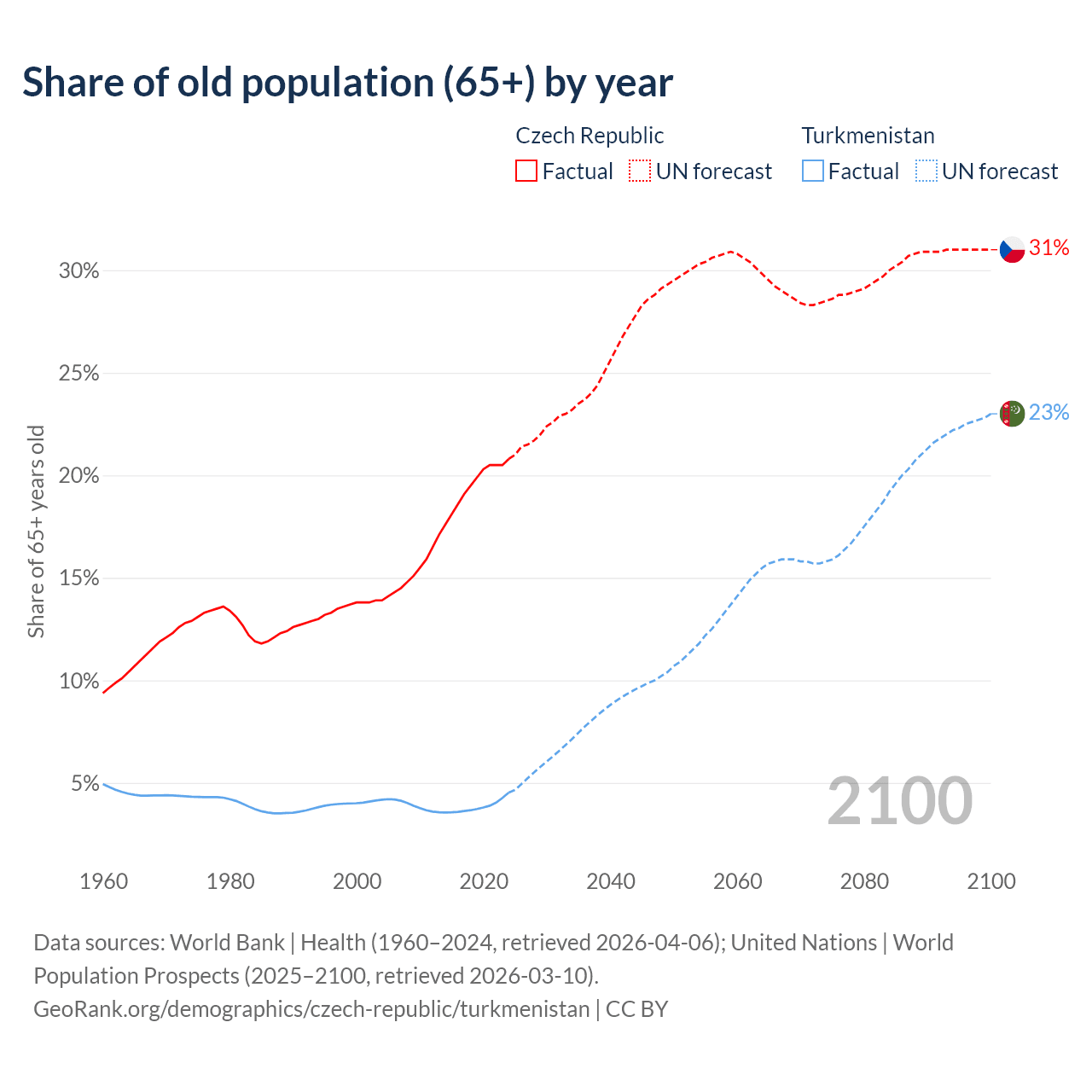 The share of older people aged 65 and over is 20.8% in the Czech Republic and 4.53% in Turkmenistan. Life expectancy in the Czech Republic compared to Turkmenistan .