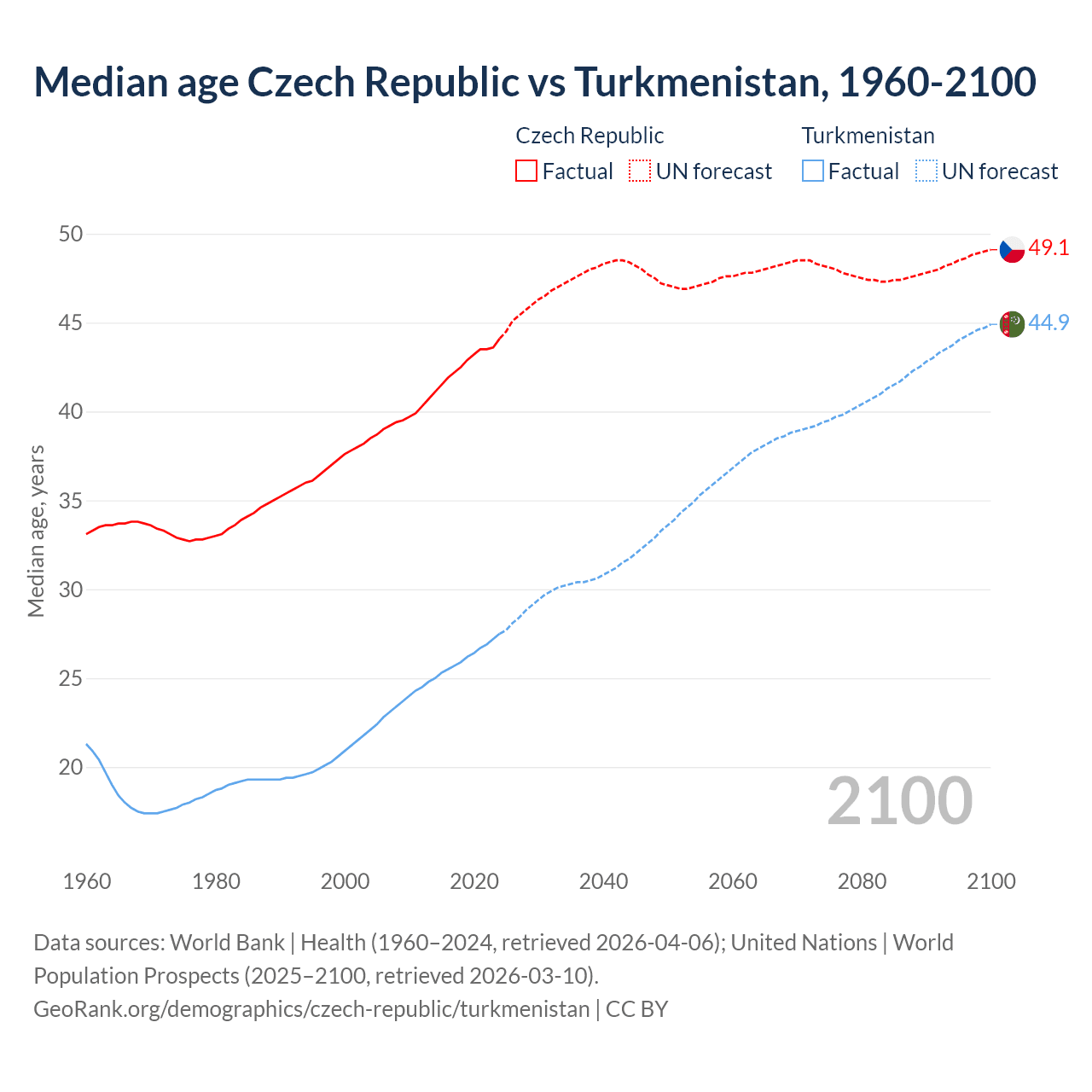 Median age Czech Republic vs Turkmenistan, 1960-2100