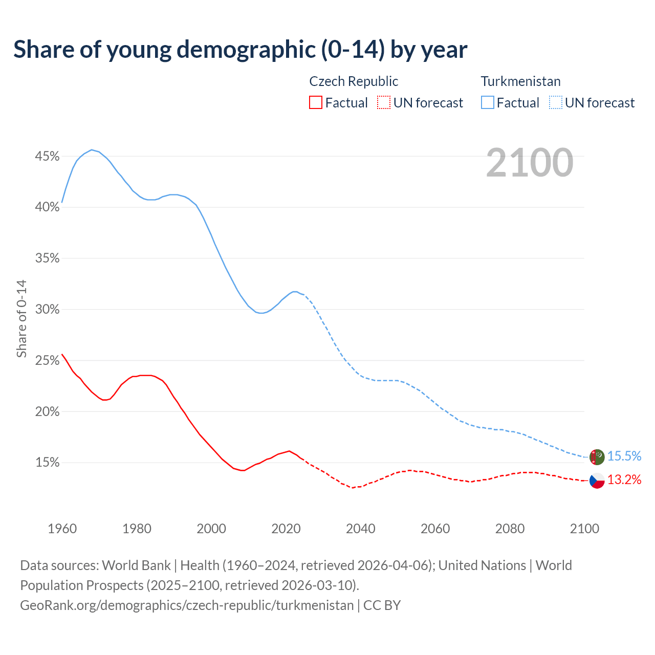 - The share of young demographic (0-15 years old) in the Czech Republic is 15.4% vs 31.5% in Turkmenistan.