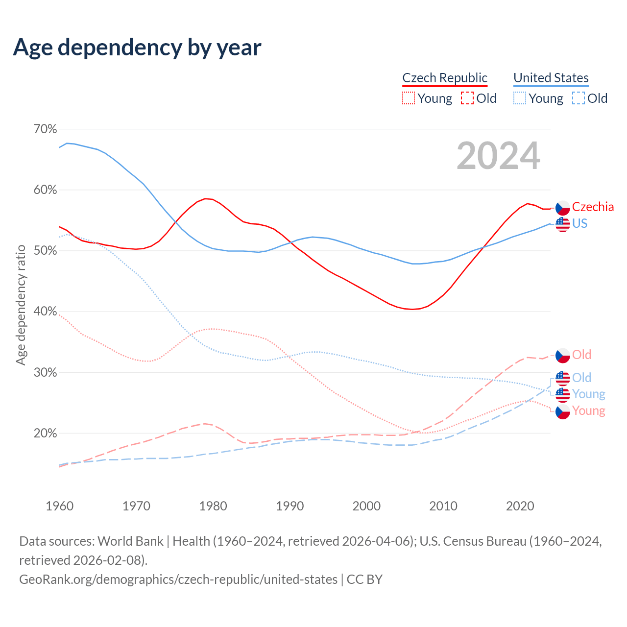 - The Czech Republic is ranked 21/196 by median age (oldest to youngest) vs 50/196 for the United States.