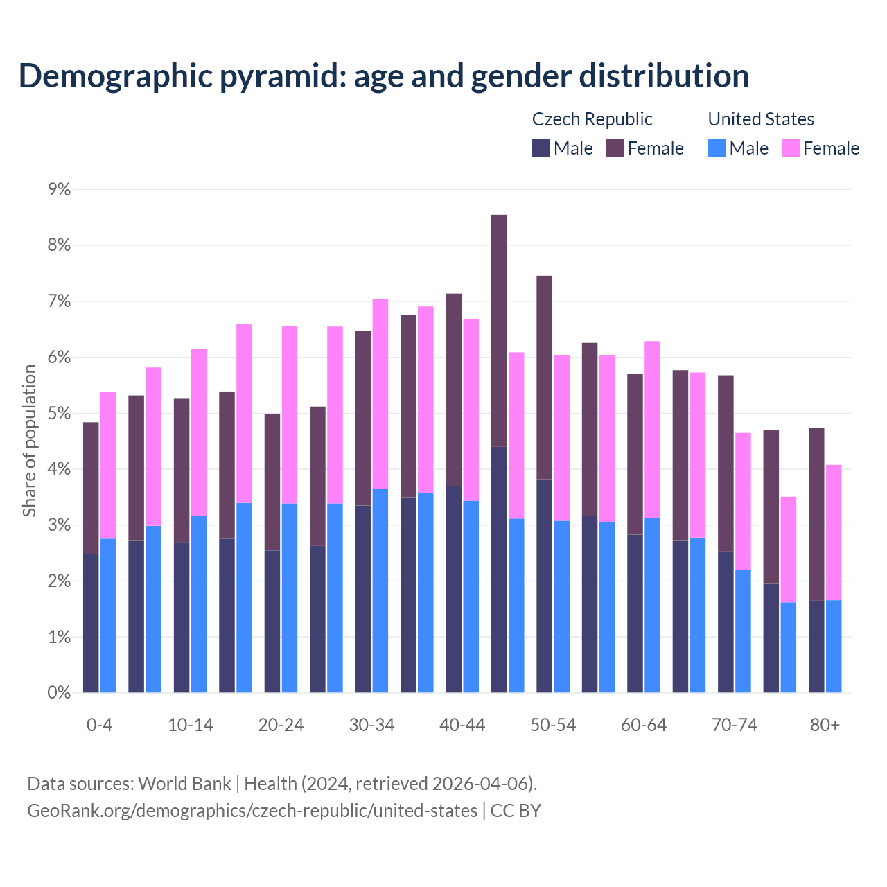 The share of older people aged 65 and over is 20.8% in the Czech Republic and 17.9% in the United States. Life expectancy in the Czech Republic compared to the United States .