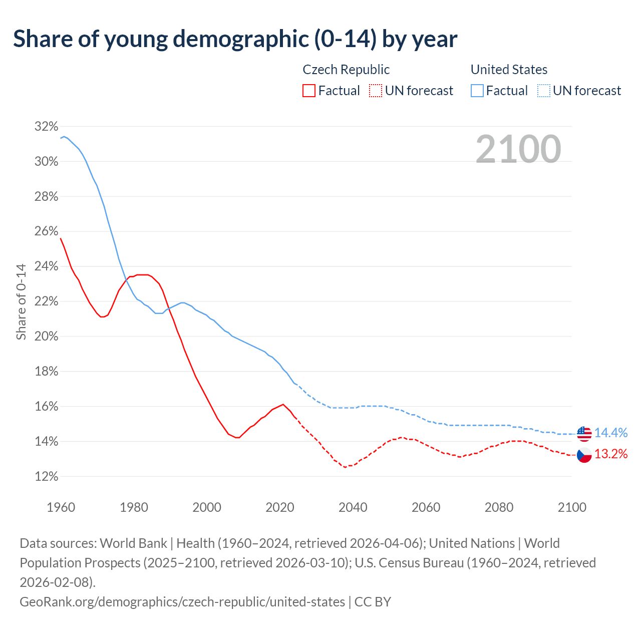 - The share of young demographic (0-15 years old) in the Czech Republic is 15.4% vs 17.3% in the United States.