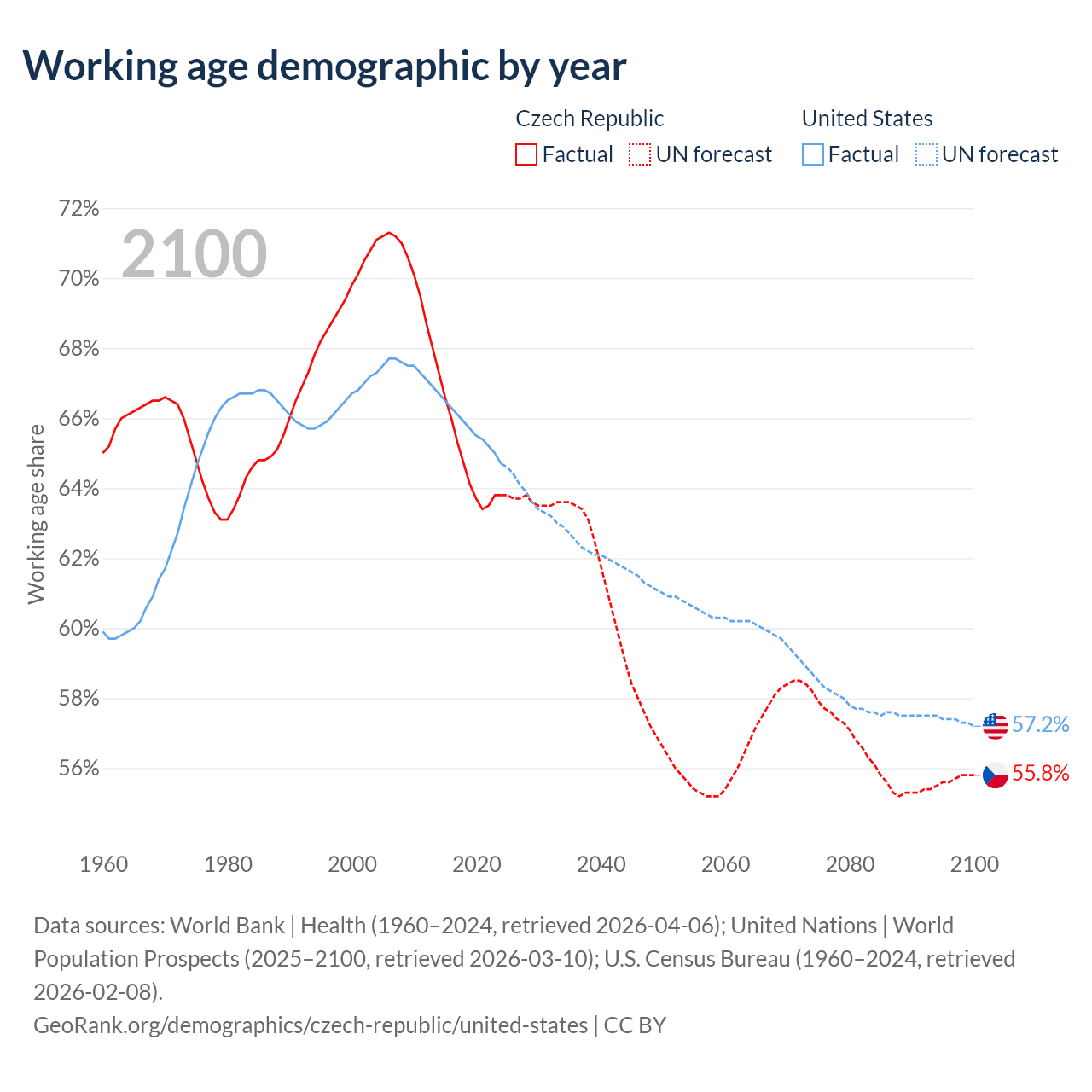 Median age Czech Republic vs United States, 1960-2100