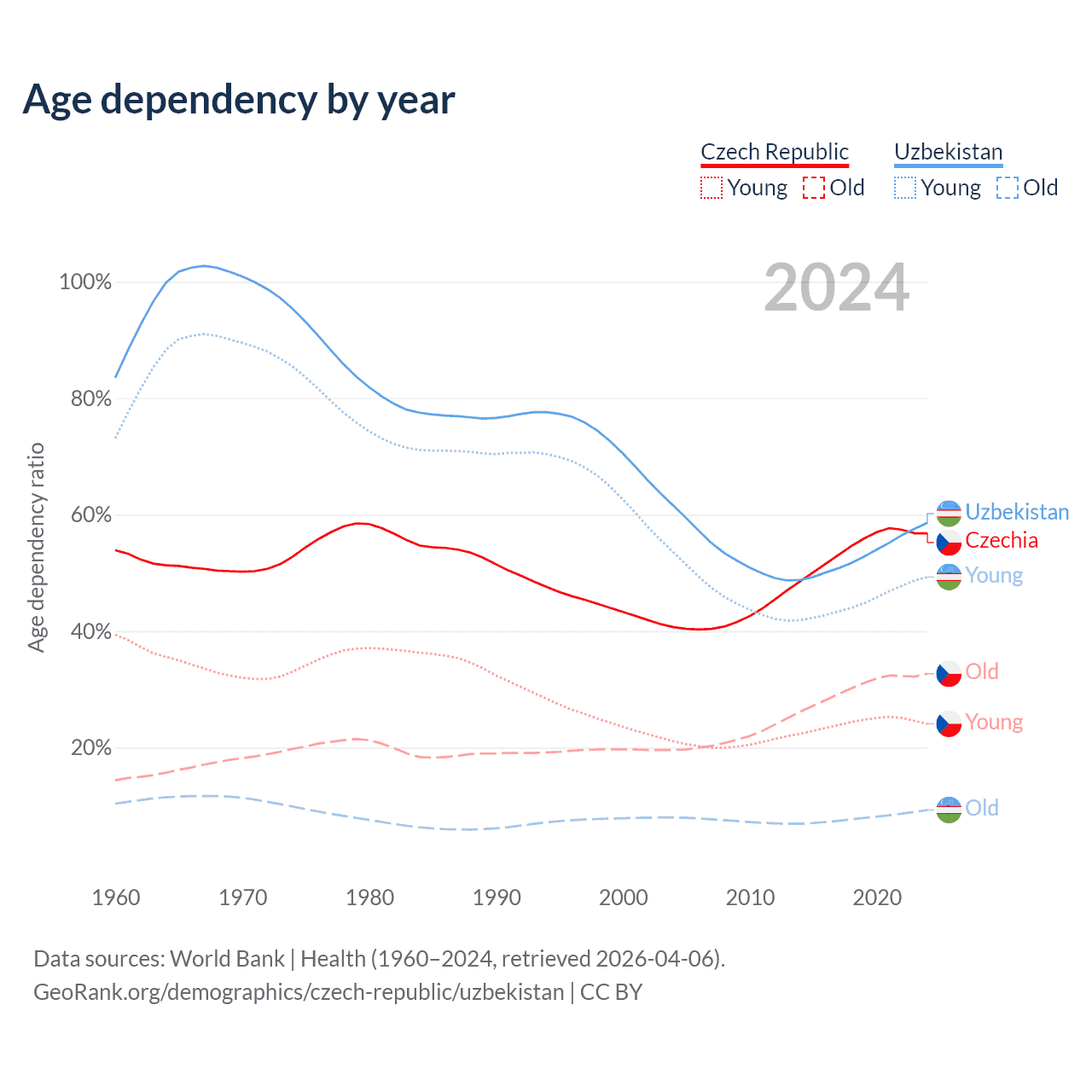 Data sources: World Bank | Health (1960–2024, retrieved 2026-04-06); U.S. Census Bureau (1960–2024, retrieved 2026-02-08).