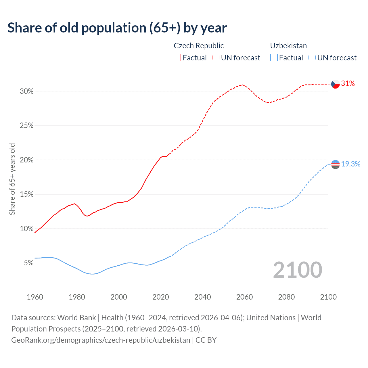 - The share of old-age demographic (65+) in the Czech Republic is 20.8% vs 5.86% in Uzbekistan.