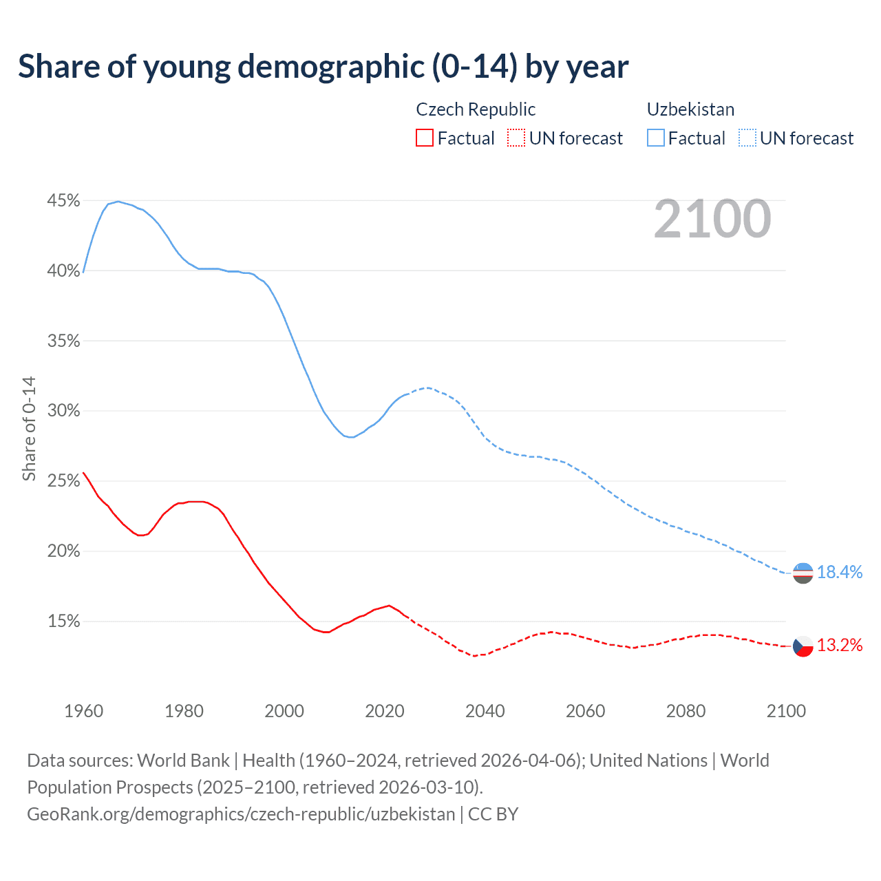 - The share of young demographic (0-15 years old) in the Czech Republic is 15.4% vs 31.1% in Uzbekistan.