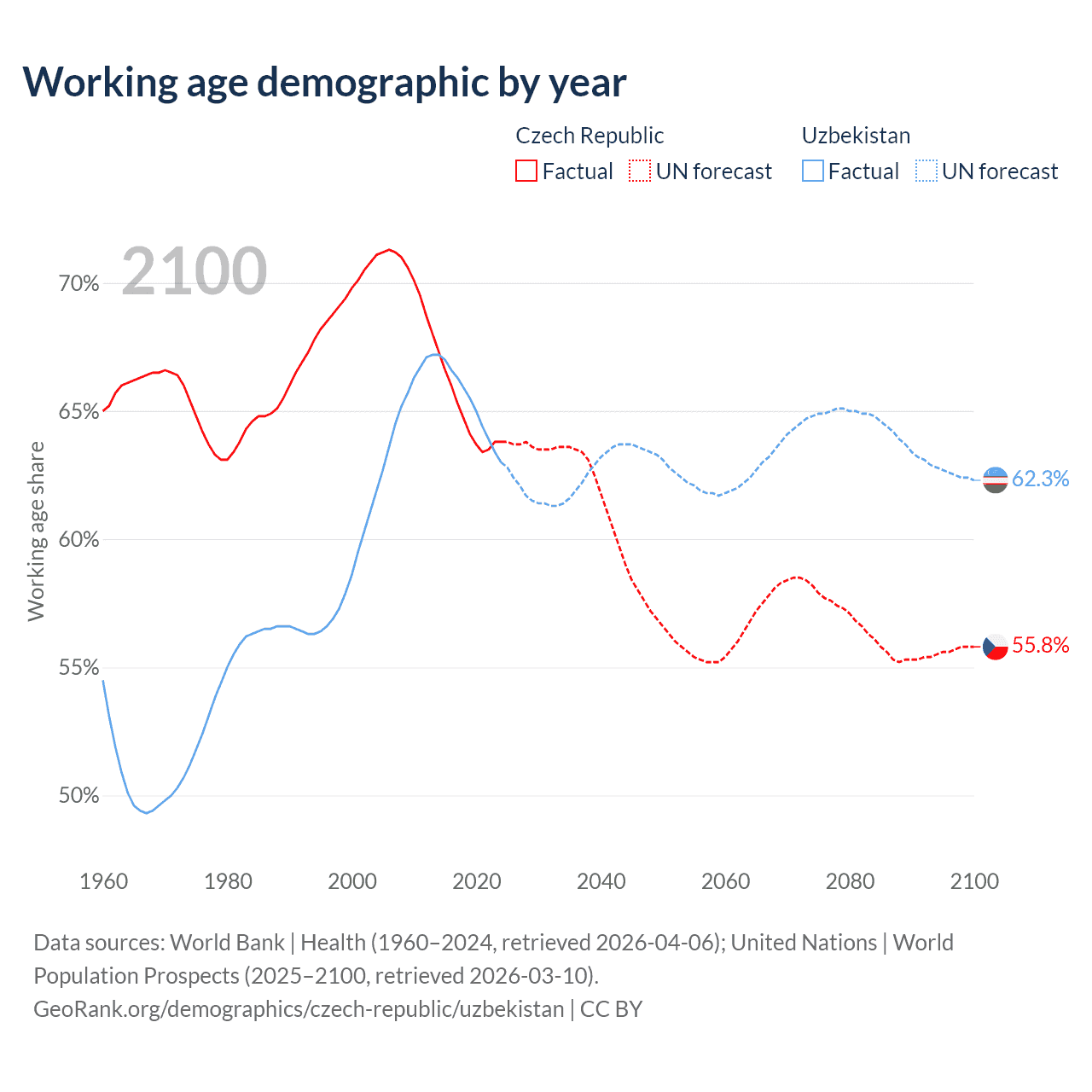 Median age Czech Republic vs Uzbekistan, 1960-2100
