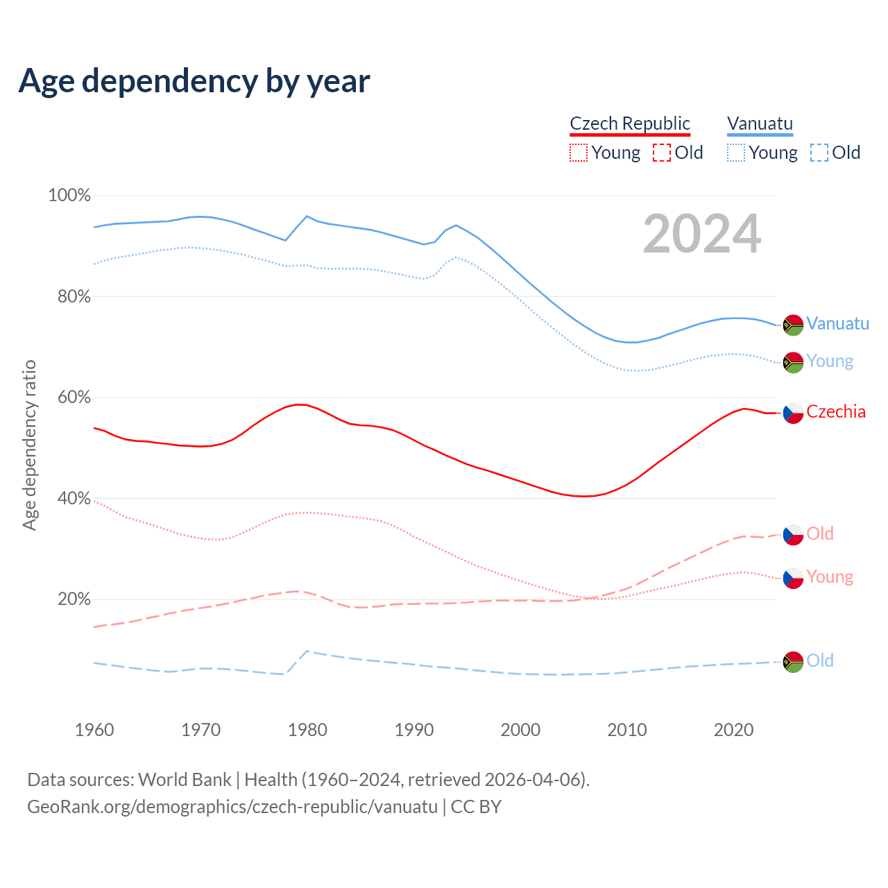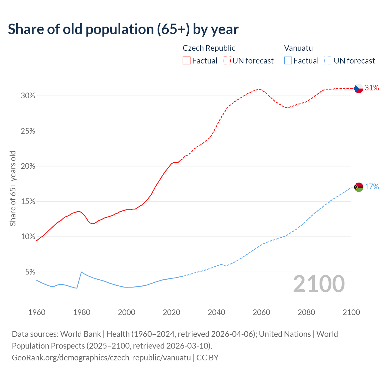 - The share of old-age demographic (65+) in the Czech Republic is 20.8% vs 4.3% in Vanuatu.