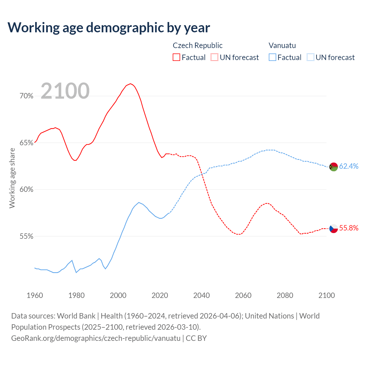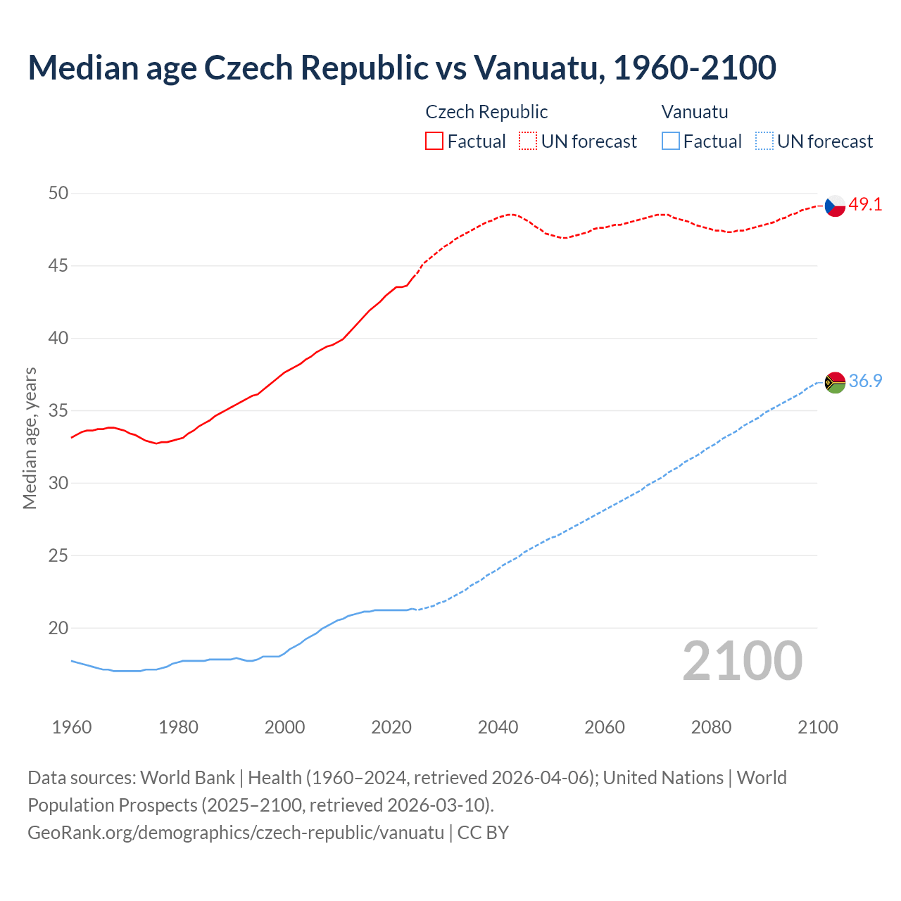 Median age Czech Republic vs Vanuatu, 1960-2100