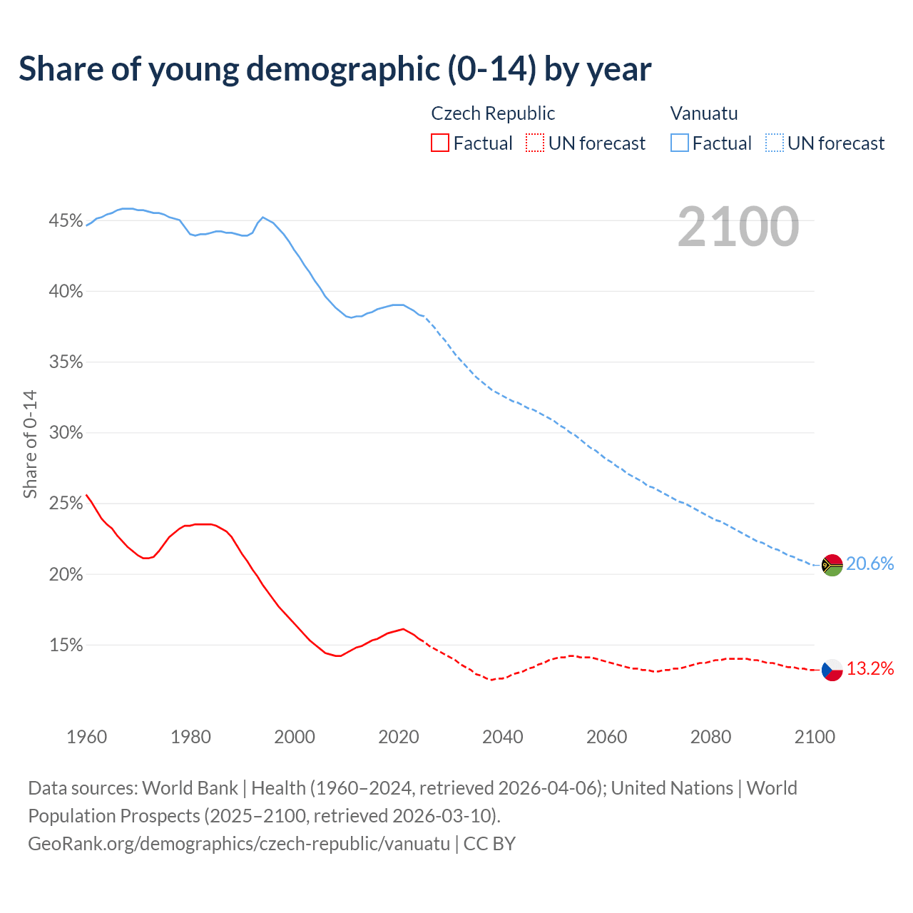 - The share of young demographic (0-15 years old) in the Czech Republic is 15.4% vs 38.3% in Vanuatu.