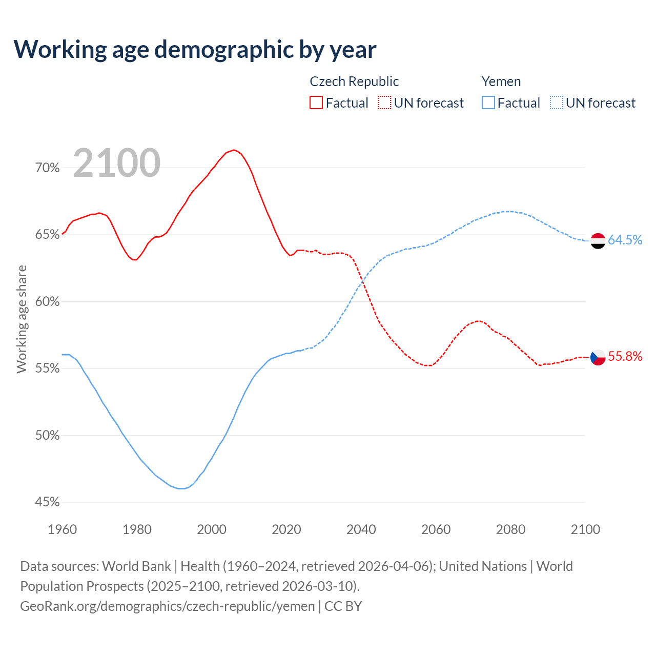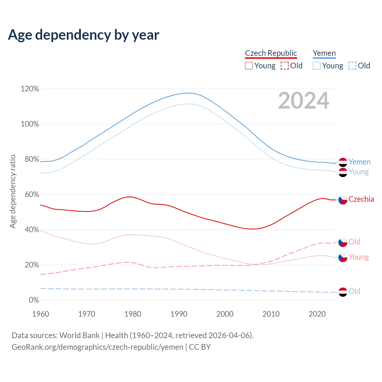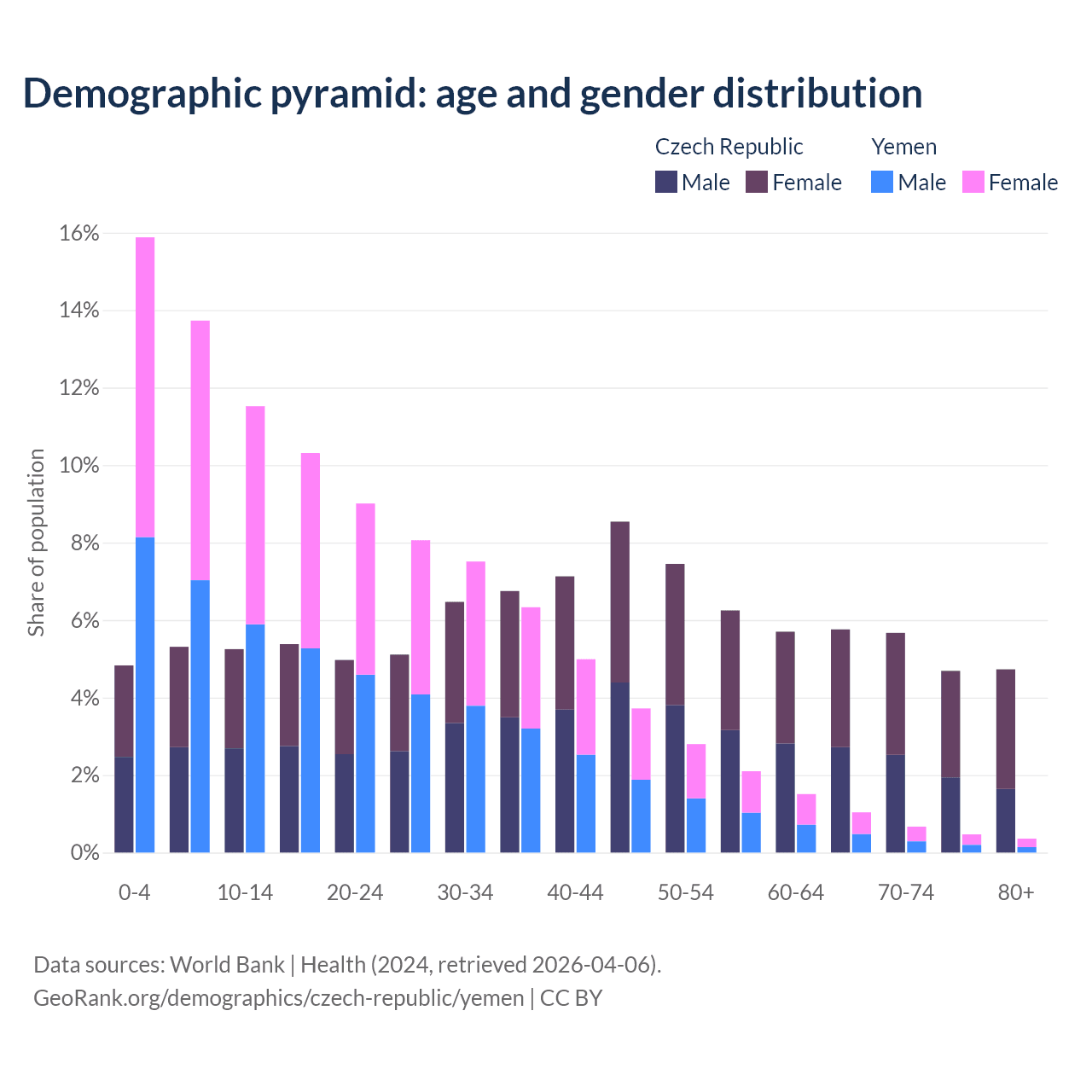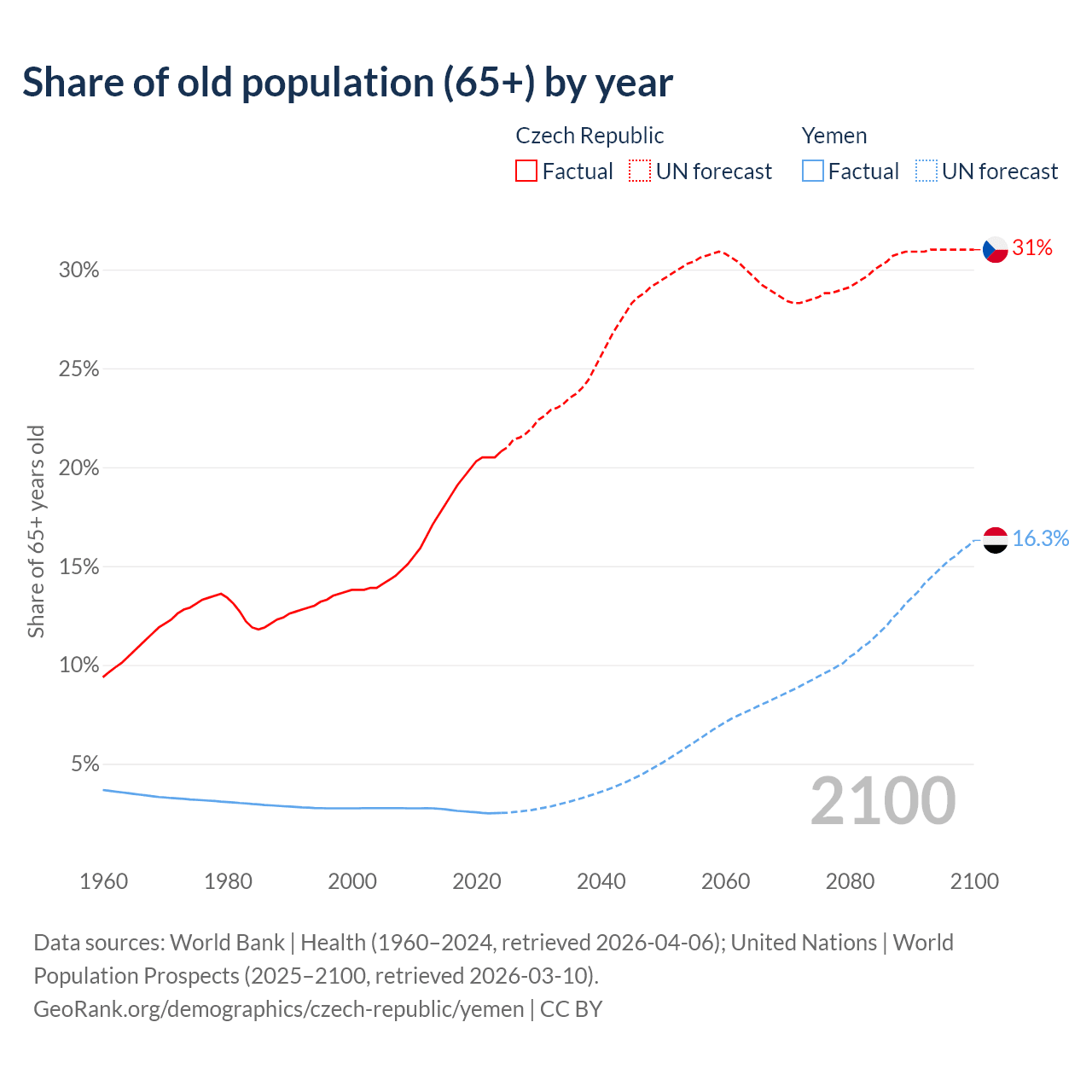 The share of older people aged 65 and over is 20.8% in the Czech Republic and 2.52% in Yemen. Life expectancy in the Czech Republic compared to Yemen .