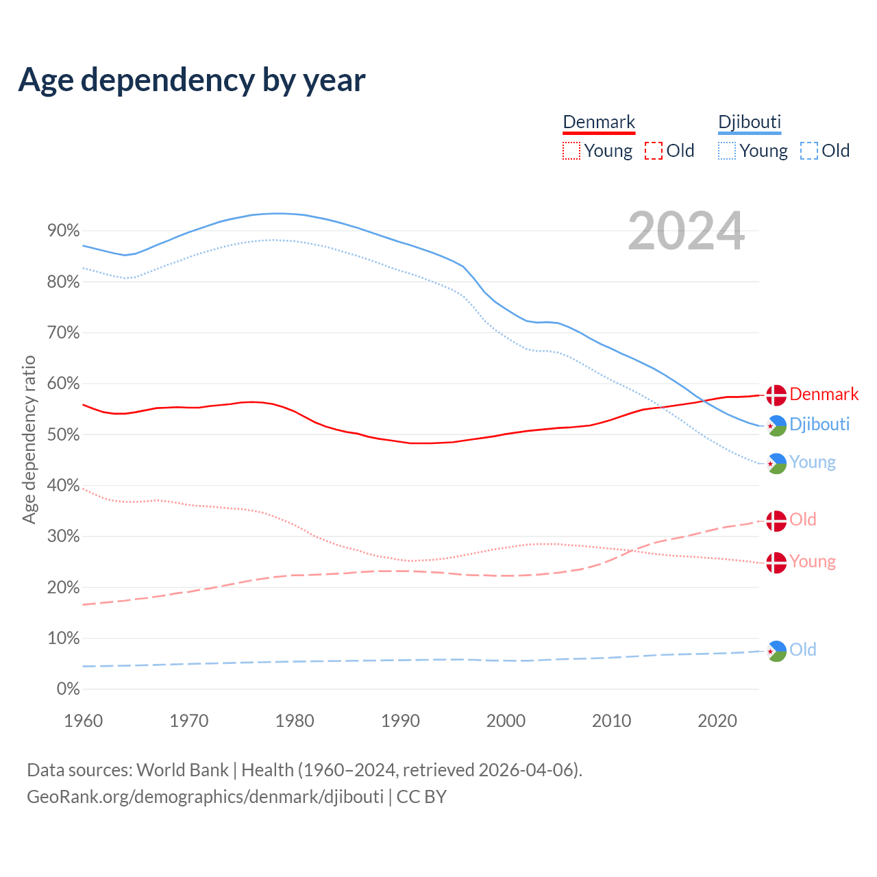 - The share of old-age demographic (65+) in Denmark is 20.9% vs 4.85% in Djibouti.