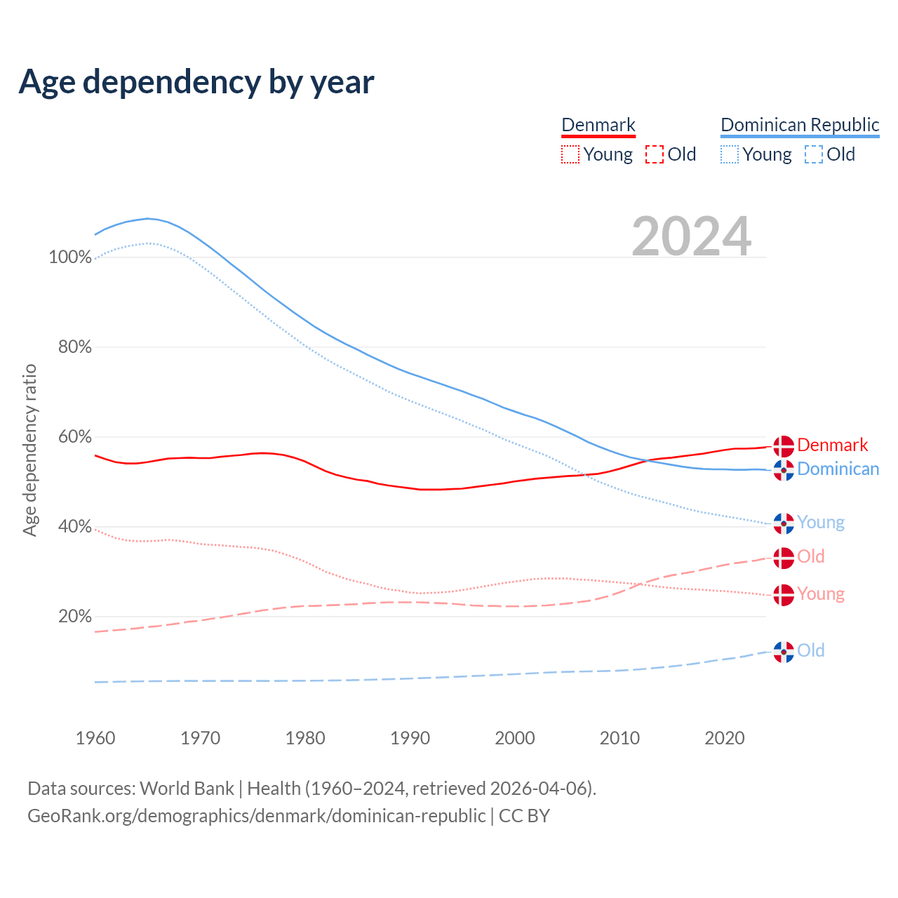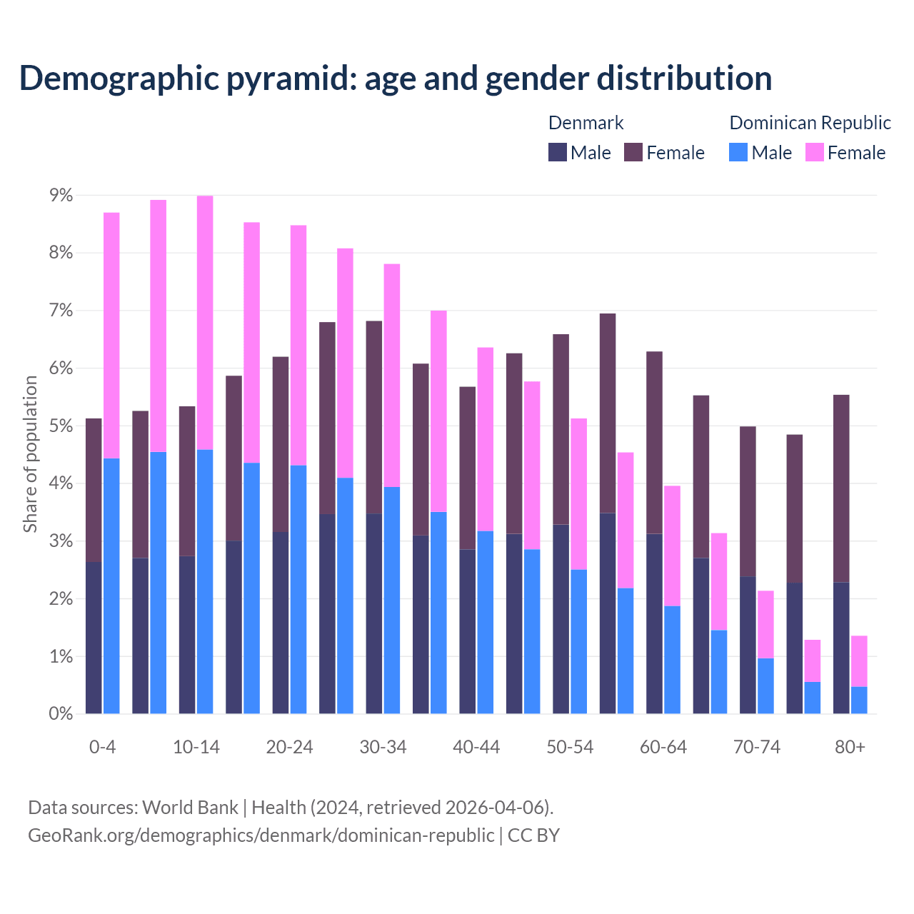 - Denmark is ranked 34/196 by median age (oldest to youngest) vs 112/196 for the Dominican Republic.