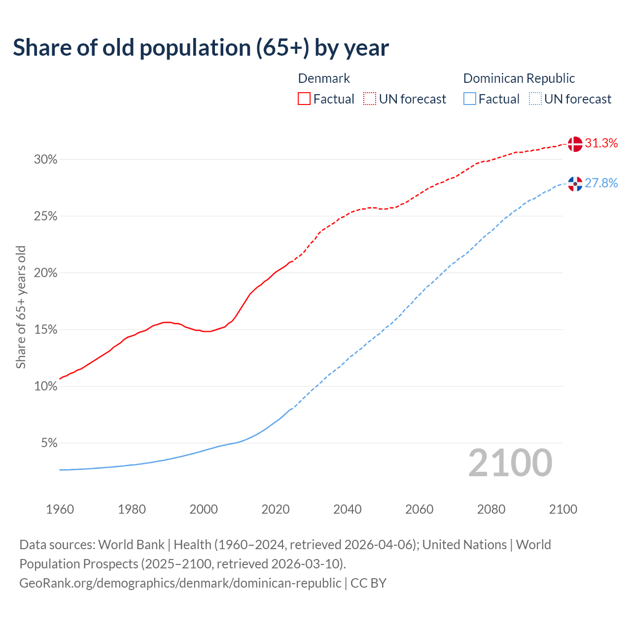 - The share of old-age demographic (65+) in Denmark is 20.9% vs 7.88% in the Dominican Republic.