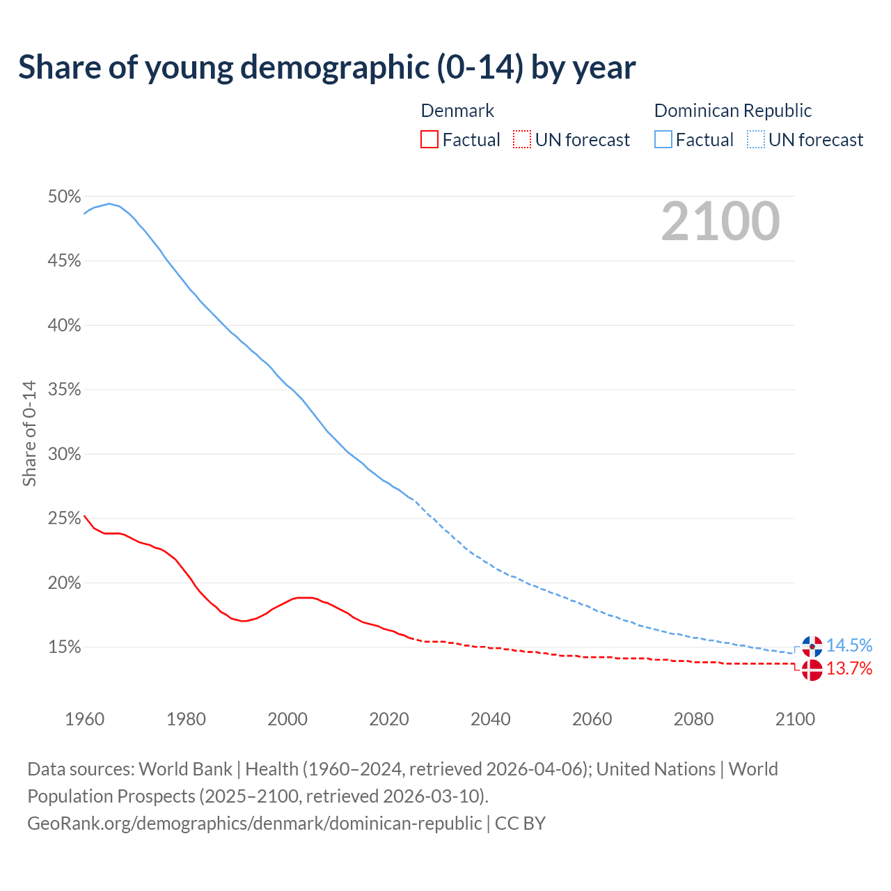 - The share of young demographic (0-15 years old) in Denmark is 15.7% vs 26.6% in the Dominican Republic.