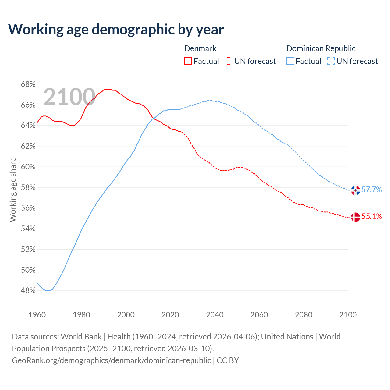 - Denmark has 3.83M working age adults (aged 15-64) vs 7.63M in the Dominican Republic.