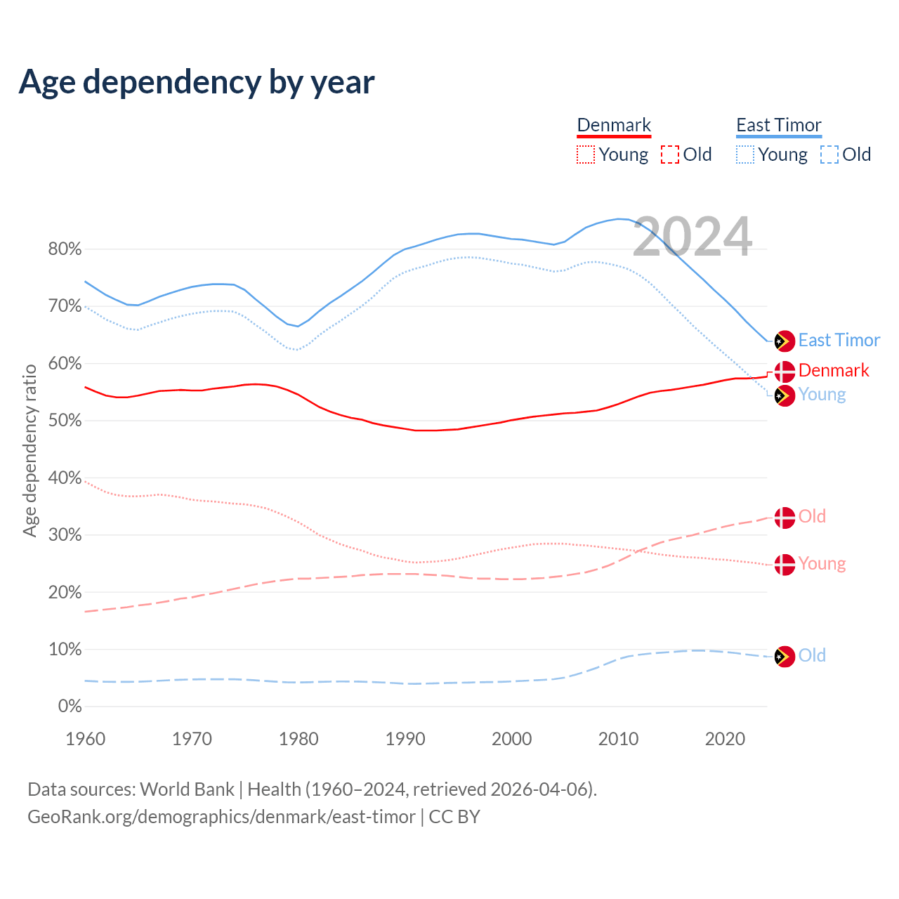 - The share of old-age demographic (65+) in Denmark is 20.9% vs 5.28% in East Timor.