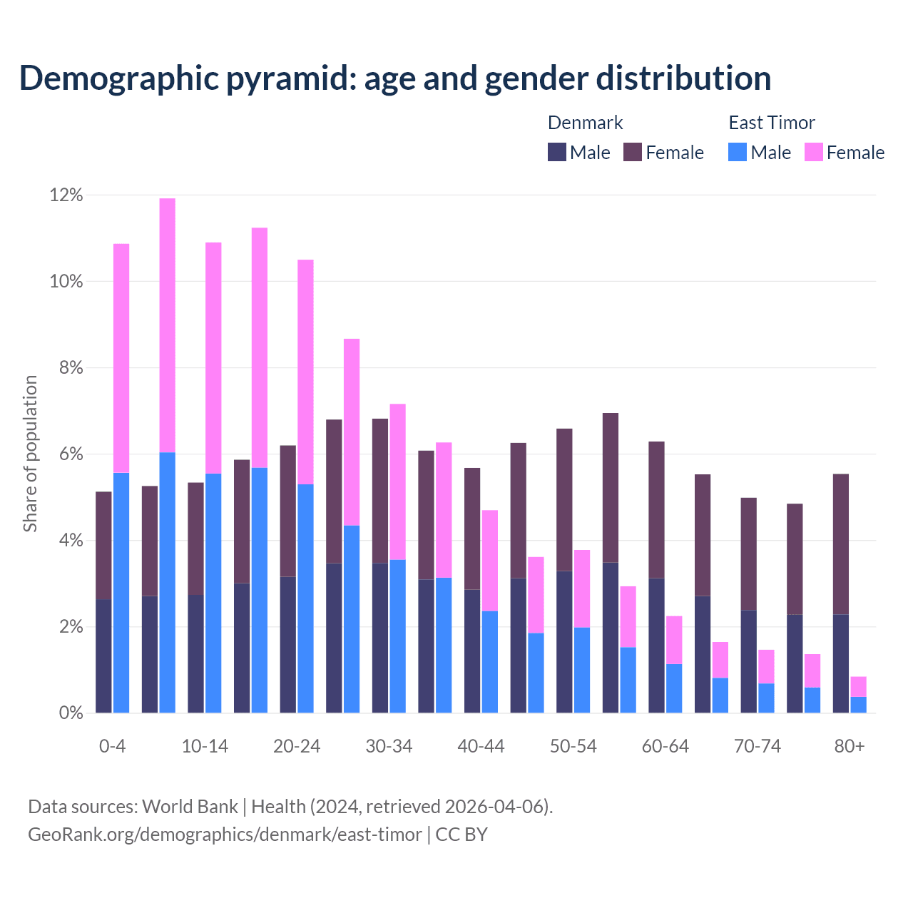 - As of 2026, the population of Denmark is 6.03M vs 1.44M in East Timor - 4.18 times difference.