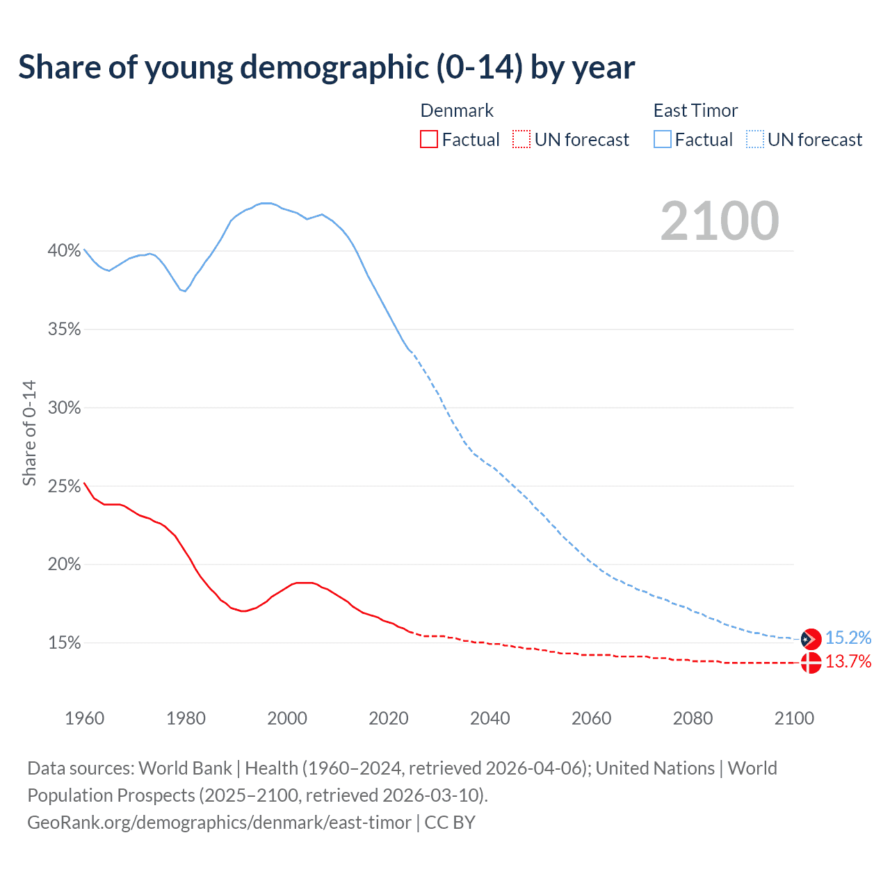 - The share of young demographic (0-15 years old) in Denmark is 15.7% vs 33.7% in East Timor.