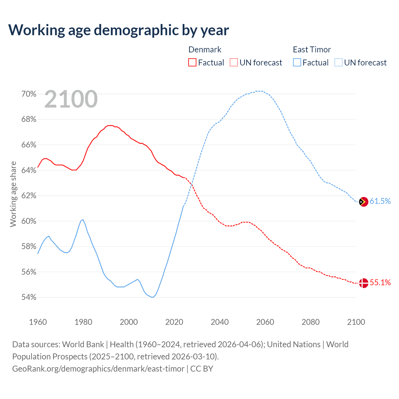 - Denmark has 3.83M working age adults (aged 15-64) vs 880K in East Timor.