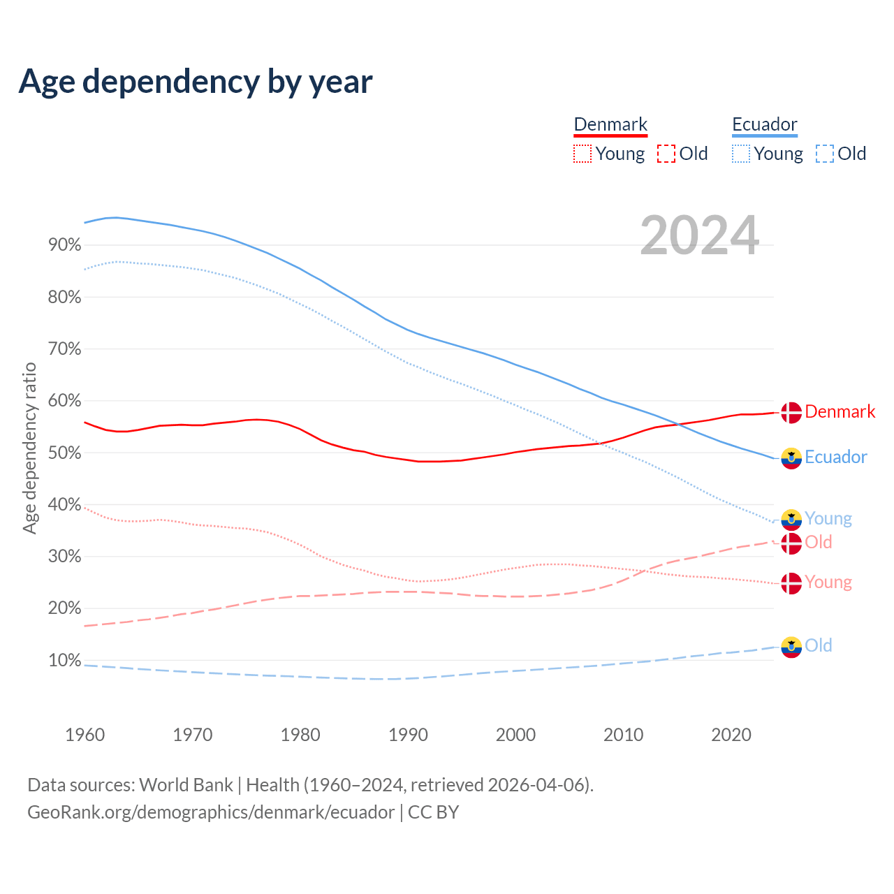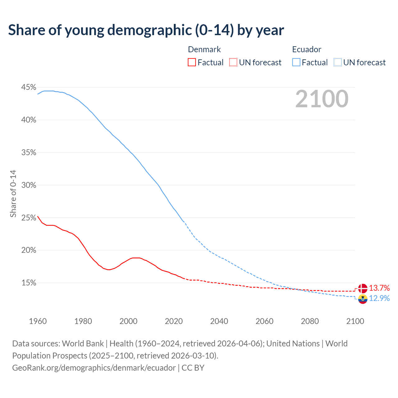 - The share of young demographic (0-15 years old) in Denmark is 15.7% vs 24.5% in Ecuador.