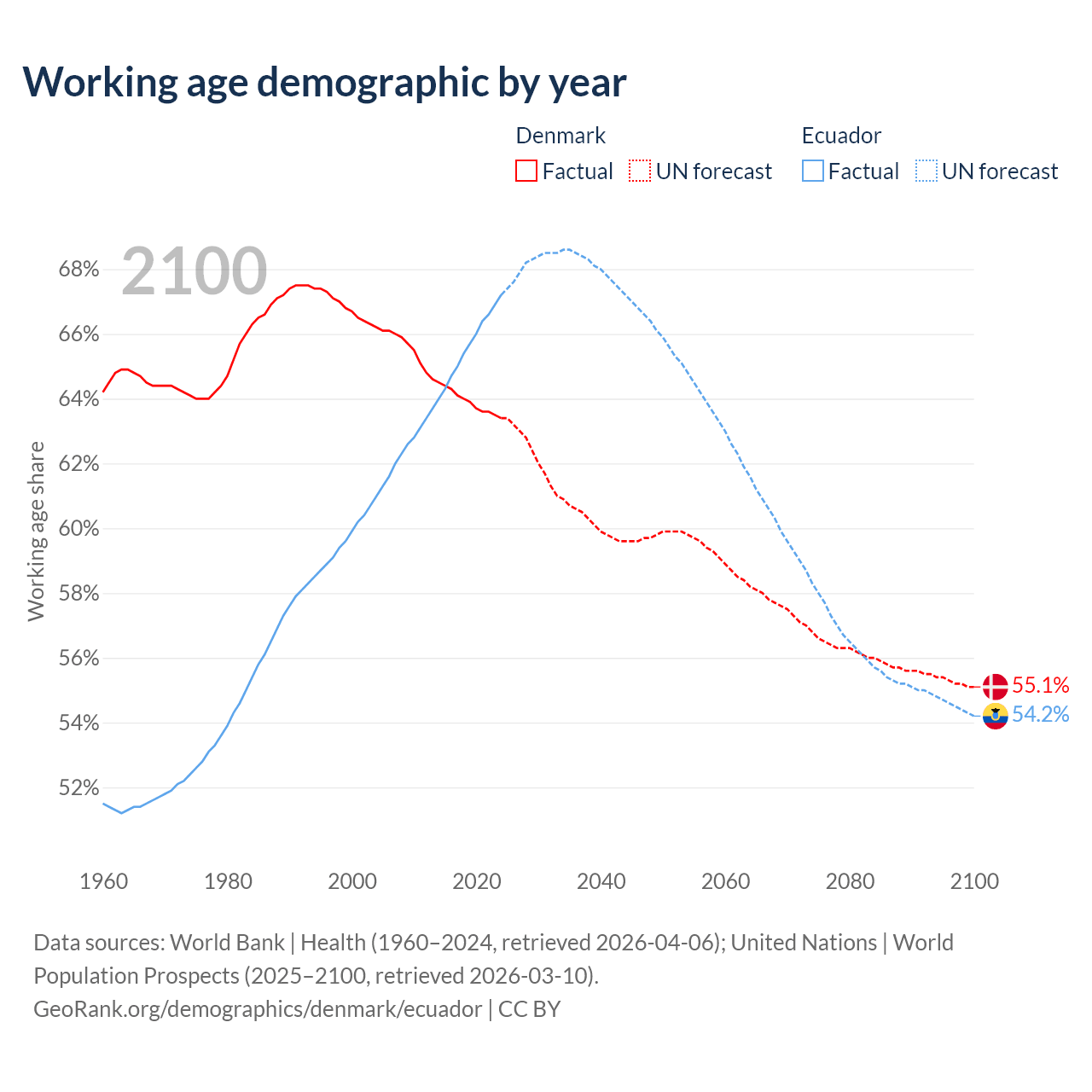 Median age Denmark vs Ecuador, 1960-2100