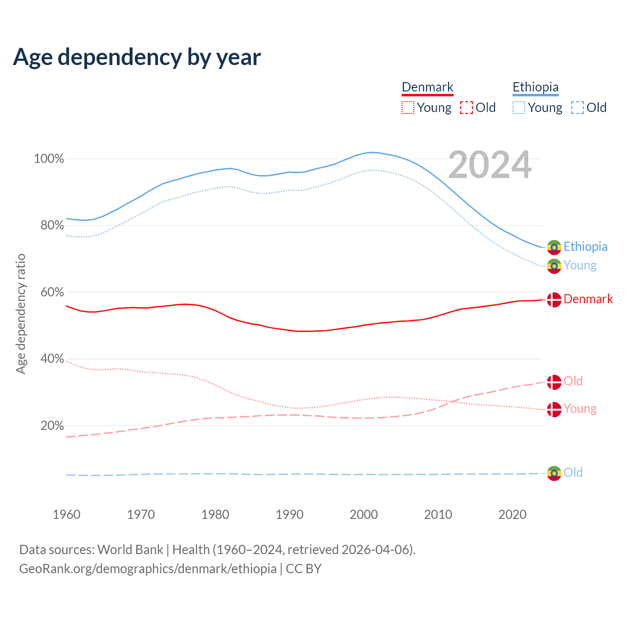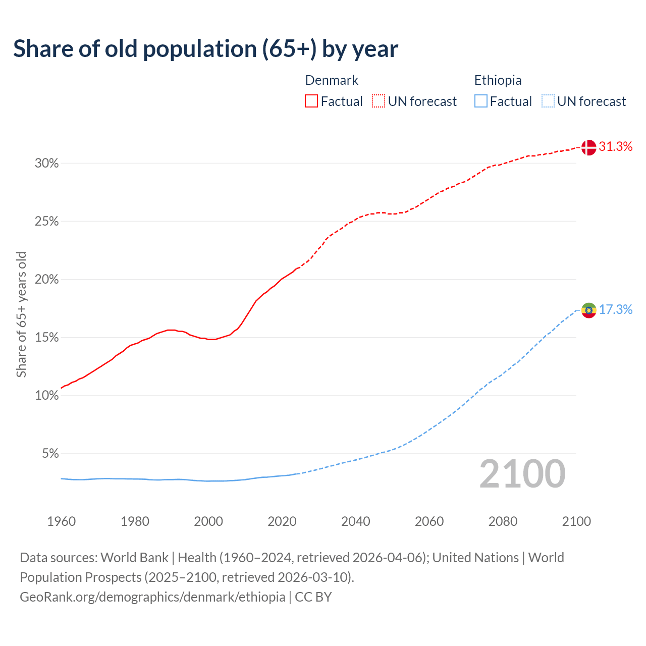 The share of older people aged 65 and over is 20.9% in Denmark and 3.23% in Ethiopia. Life expectancy in Denmark compared to Ethiopia .