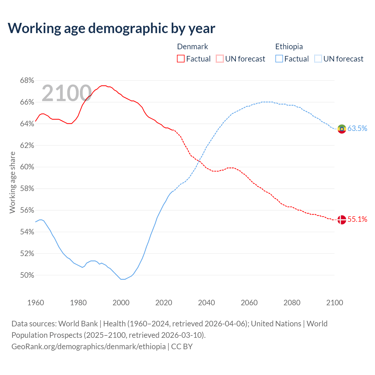 - Denmark has 3.83M working age adults (aged 15-64) vs 80.7M in Ethiopia.