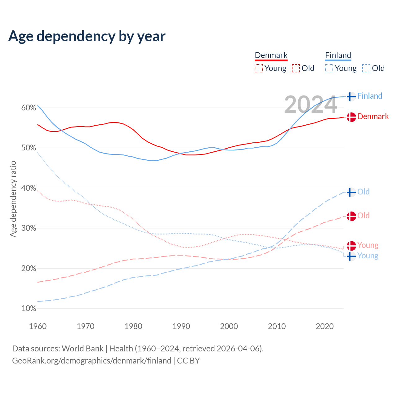 - Denmark is ranked 34/196 by median age (oldest to youngest) vs 22/196 for Finland.