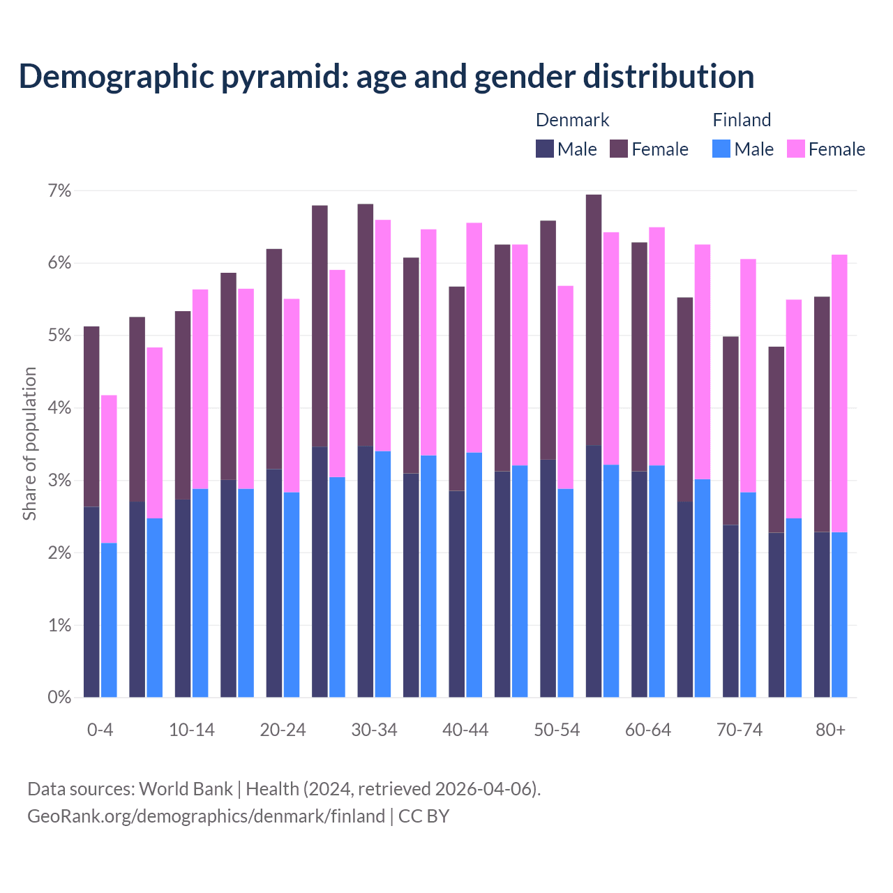 - As of 2026, the population of Denmark is 6.03M vs 5.63M in Finland.