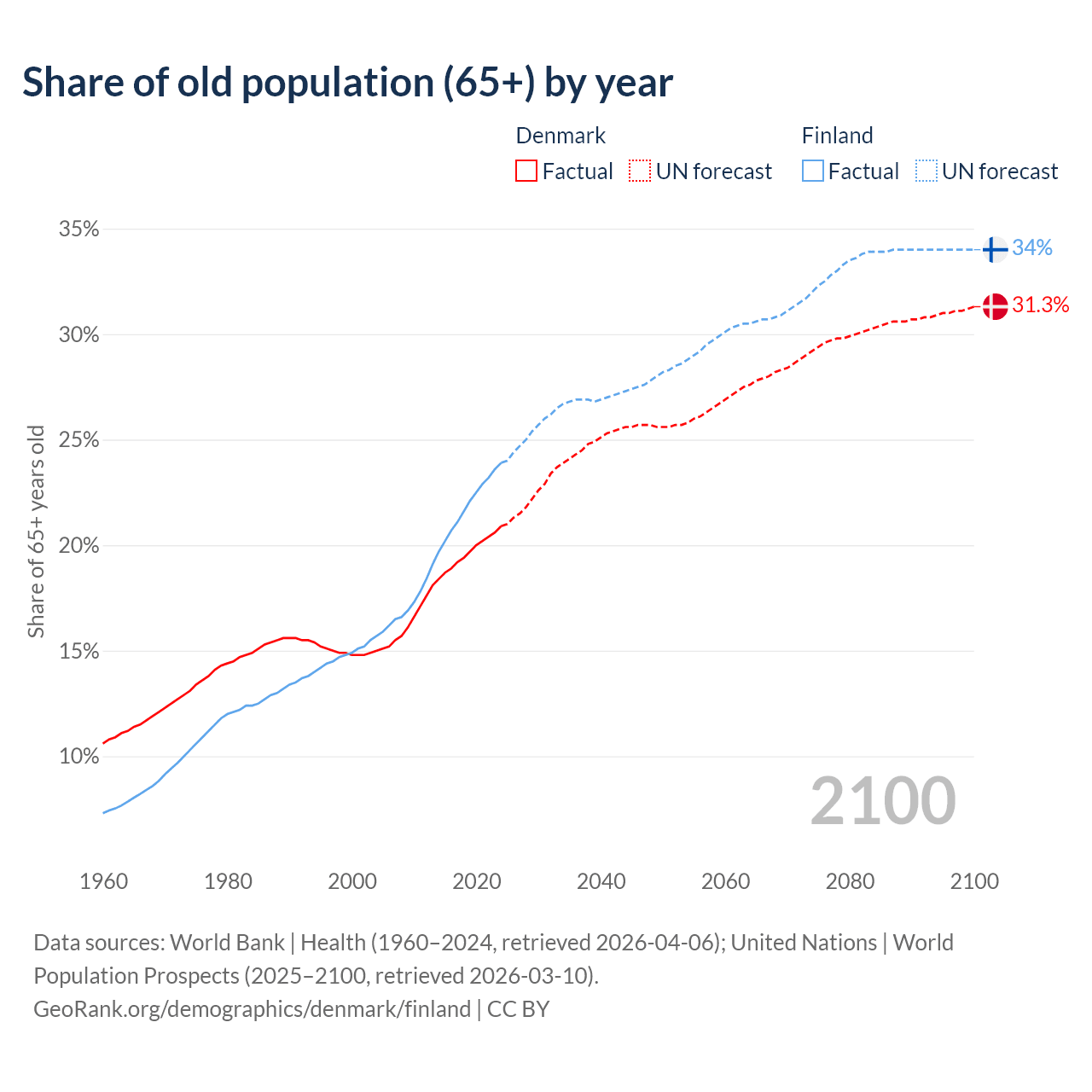 The share of older people aged 65 and over is 20.9% in Denmark and 23.9% in Finland. Life expectancy in Denmark compared to Finland .