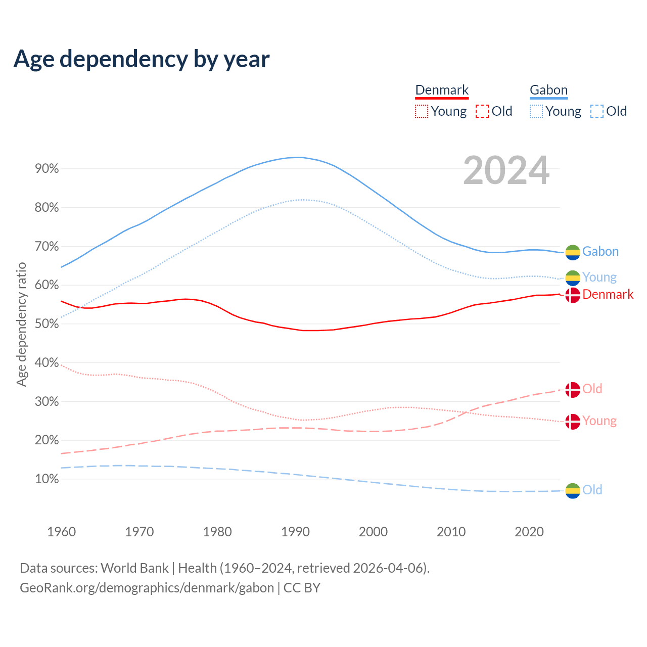 - The share of old-age demographic (65+) in Denmark is 20.9% vs 4.08% in Gabon.