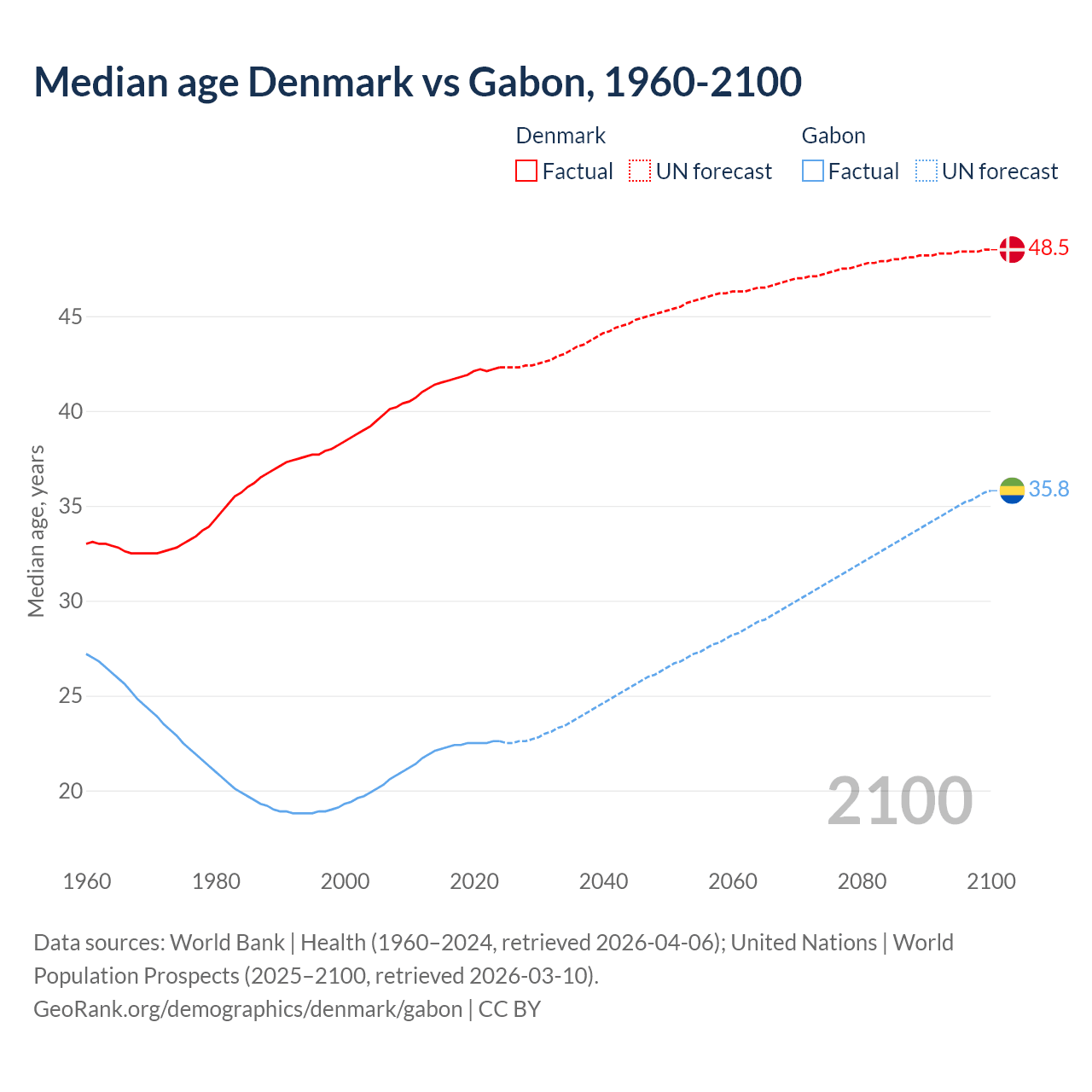 Median age Denmark vs Gabon, 1960-2100