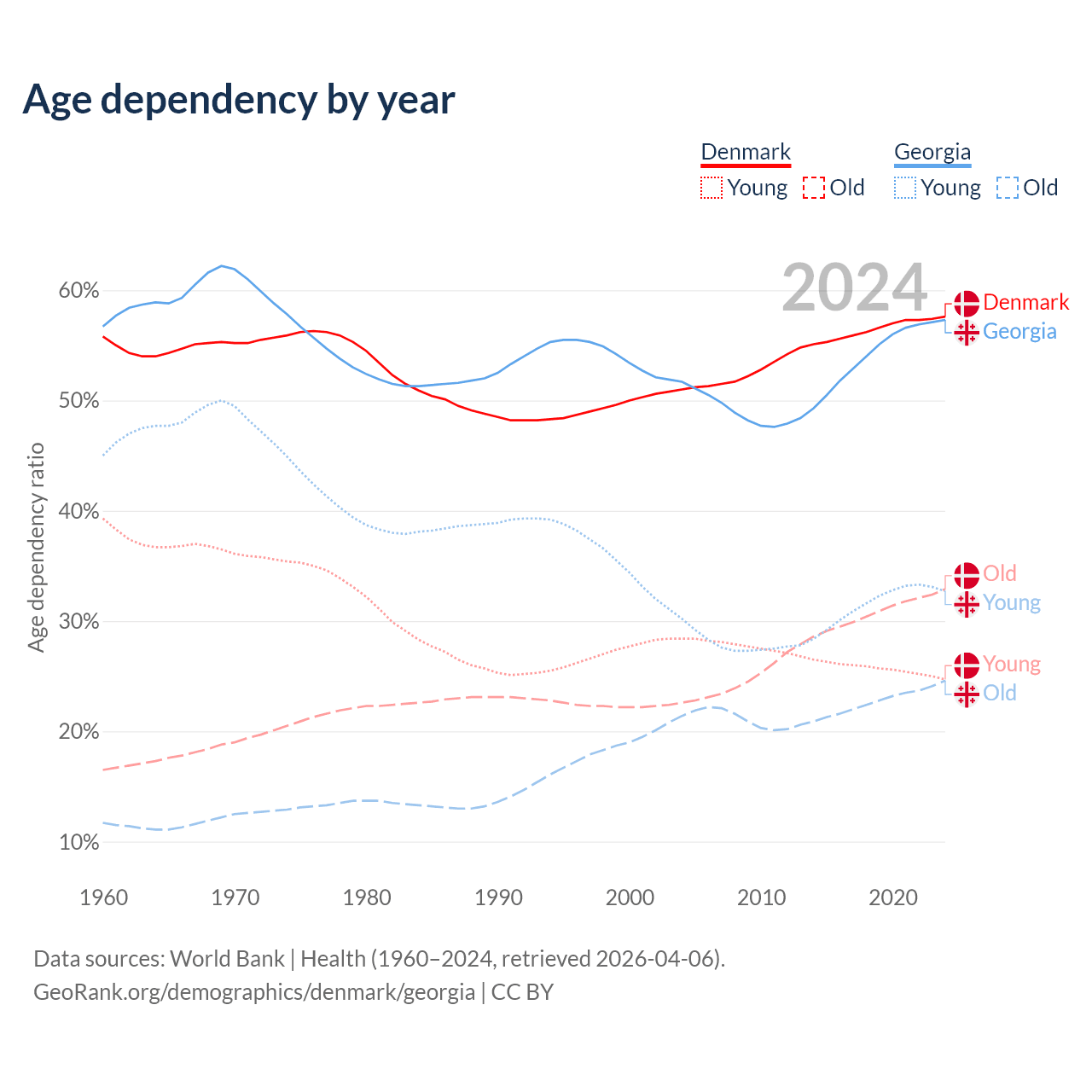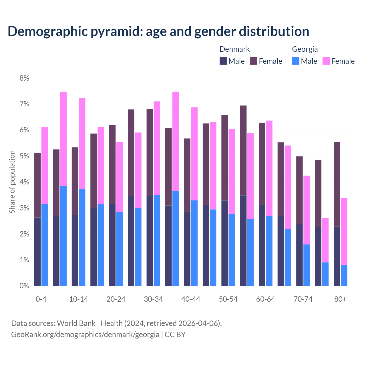 - Denmark is ranked 34/196 by median age (oldest to youngest) vs 59/196 for Georgia.