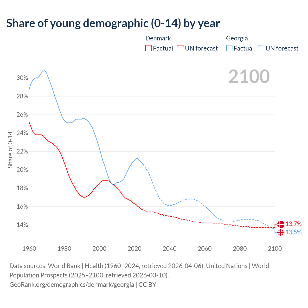 - The share of young demographic (0-15 years old) in Denmark is 15.7% vs 20.8% in Georgia.