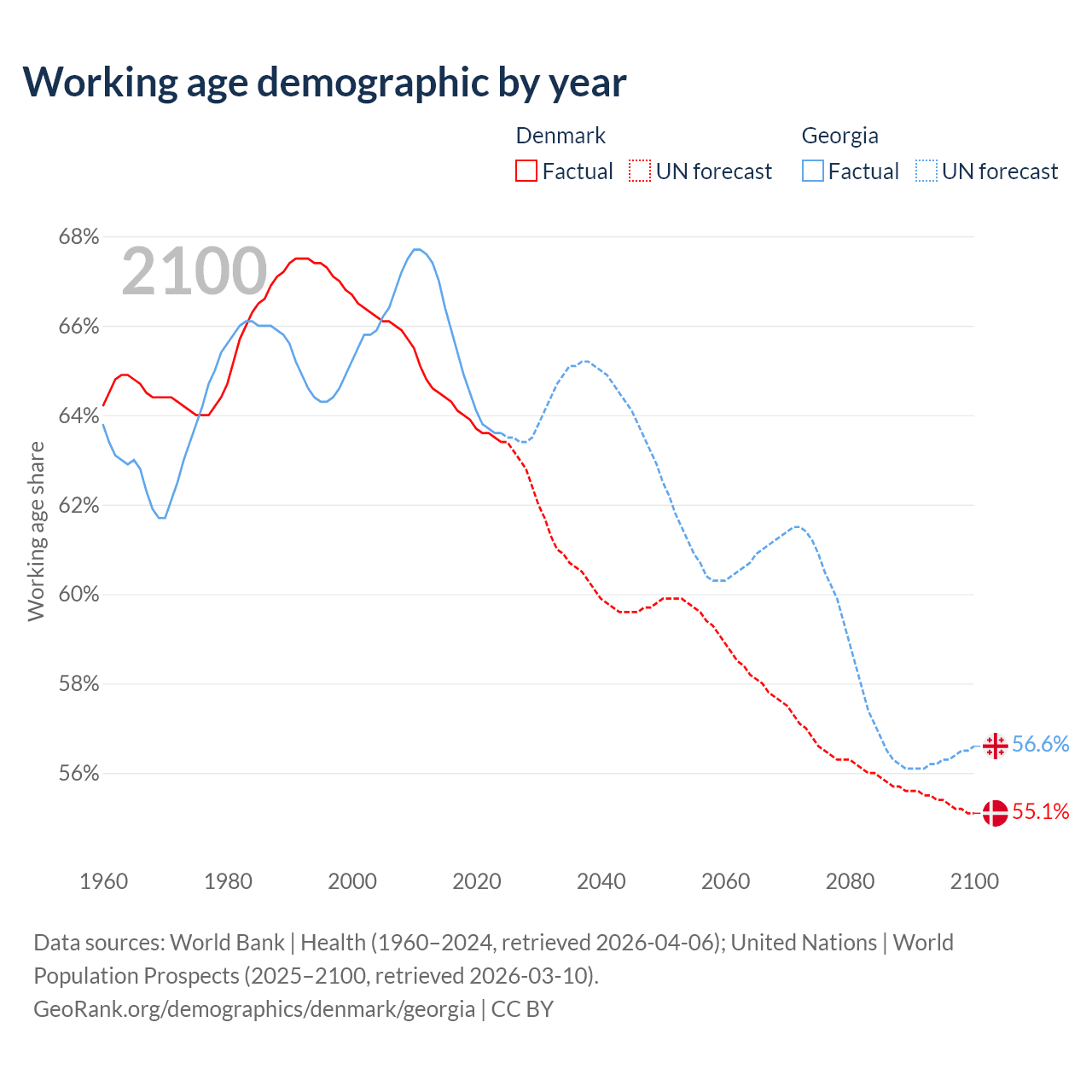 - Denmark has 3.83M working age adults (aged 15-64) vs 2.35M in Georgia.