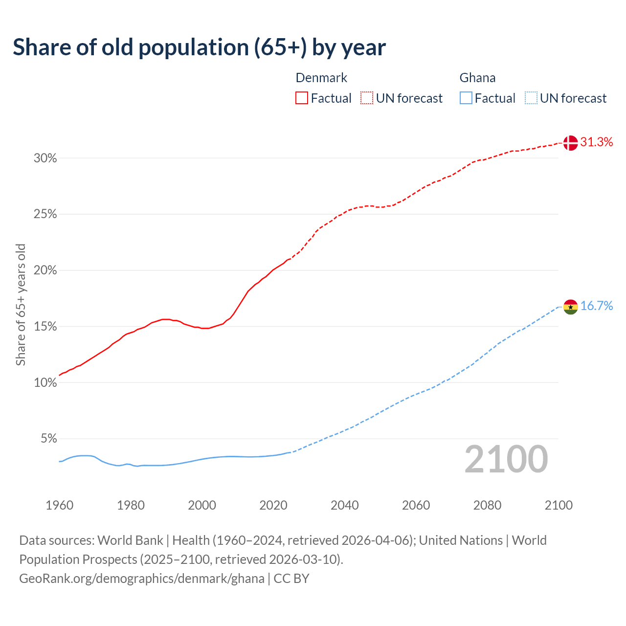 - The share of old-age demographic (65+) in Denmark is 20.9% vs 3.71% in Ghana.