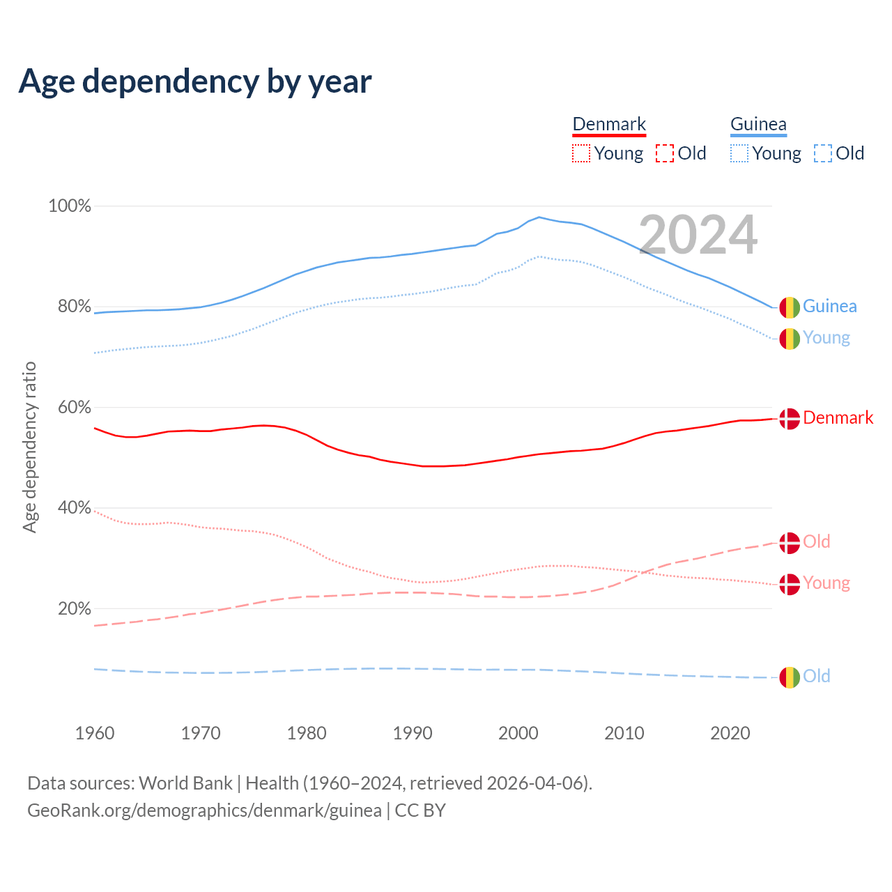 - Denmark is ranked 34/196 by median age (oldest to youngest) vs 176/196 for Guinea.