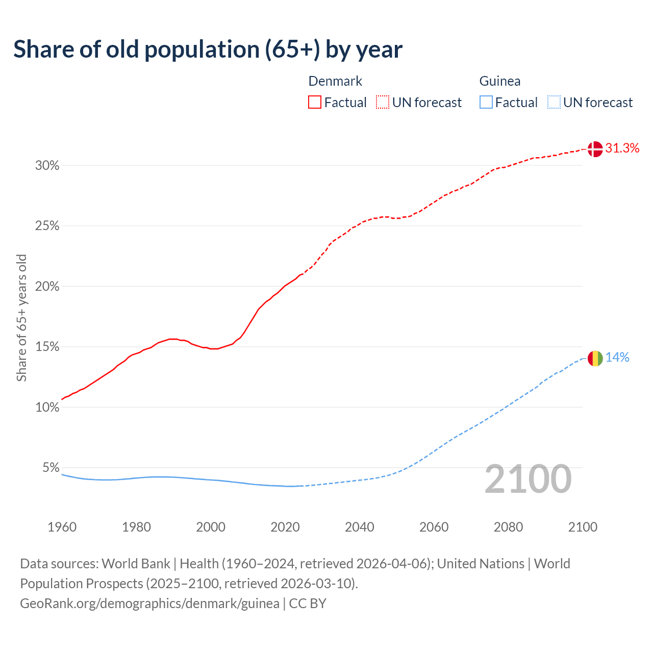- The share of old-age demographic (65+) in Denmark is 20.9% vs 3.46% in Guinea.