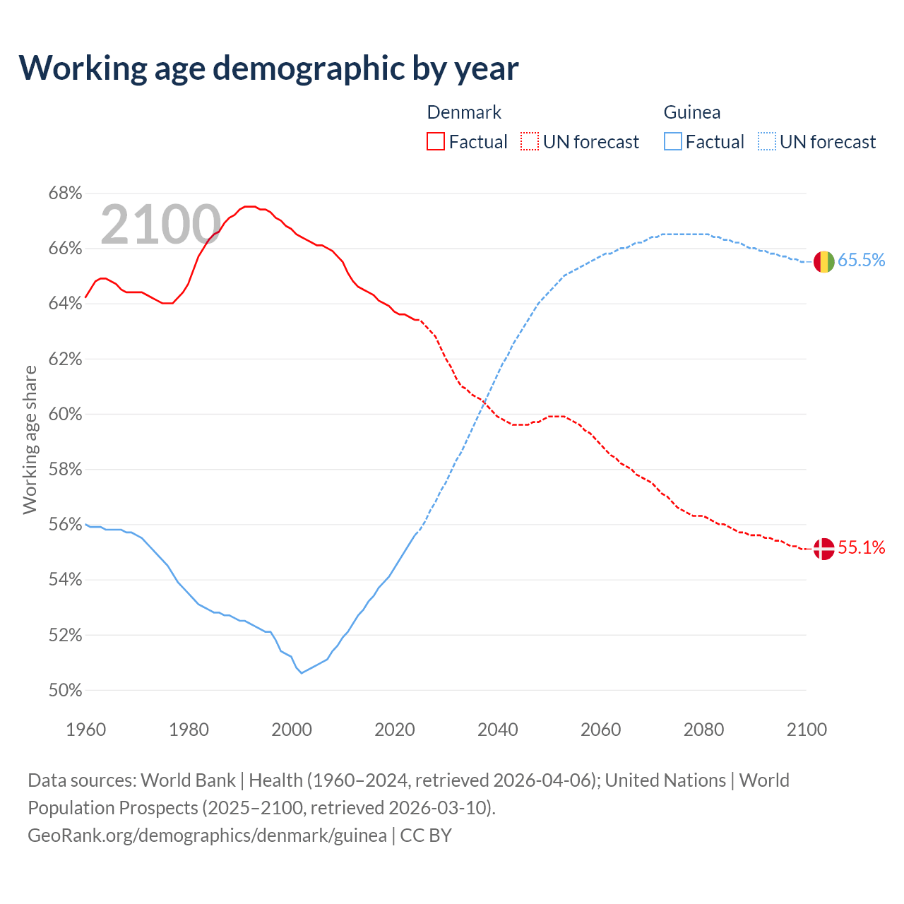 - Denmark has 3.83M working age adults (aged 15-64) vs 8.65M in Guinea.