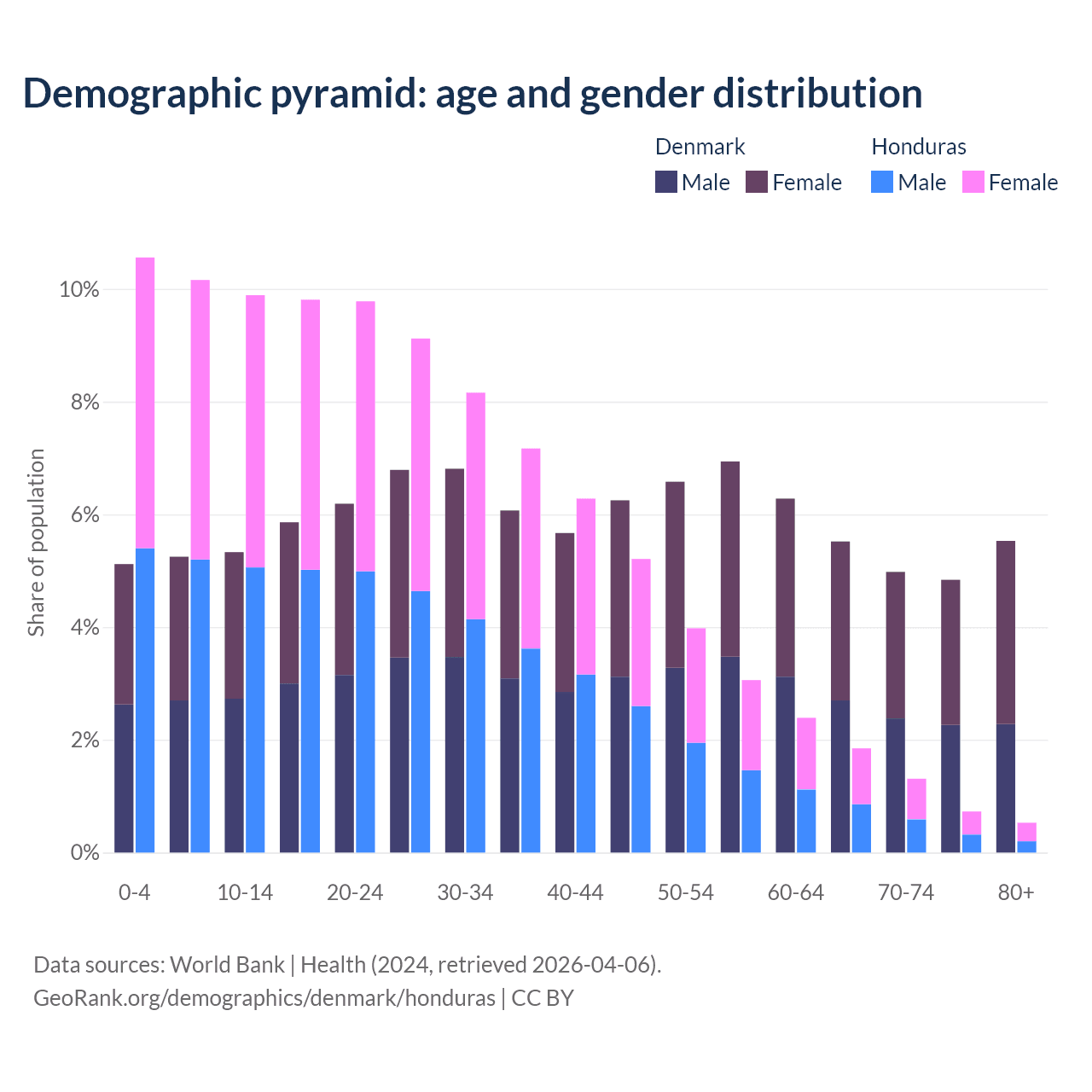 - The share of young demographic (0-15 years old) in Denmark is 15.7% vs 30.6% in Honduras.