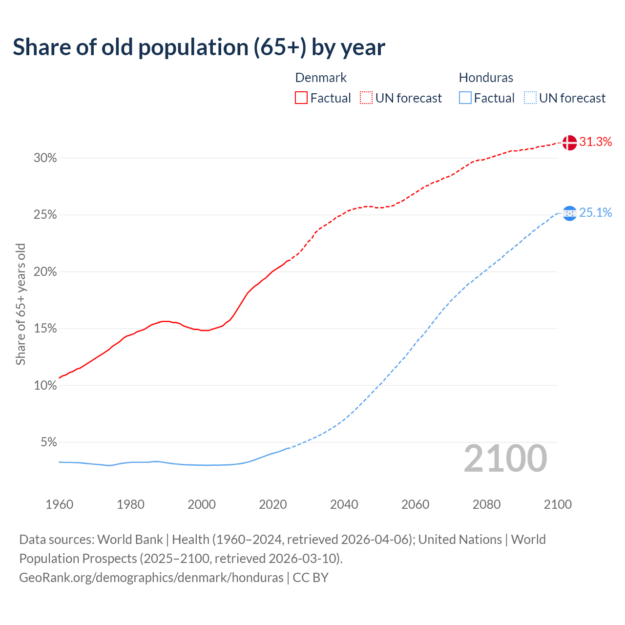 - The share of old-age demographic (65+) in Denmark is 20.9% vs 4.42% in Honduras.