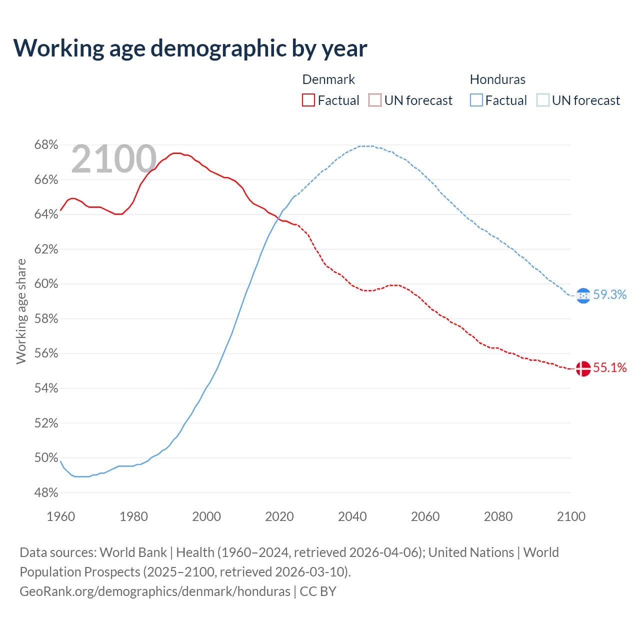 Median age Denmark vs Honduras, 1960-2100