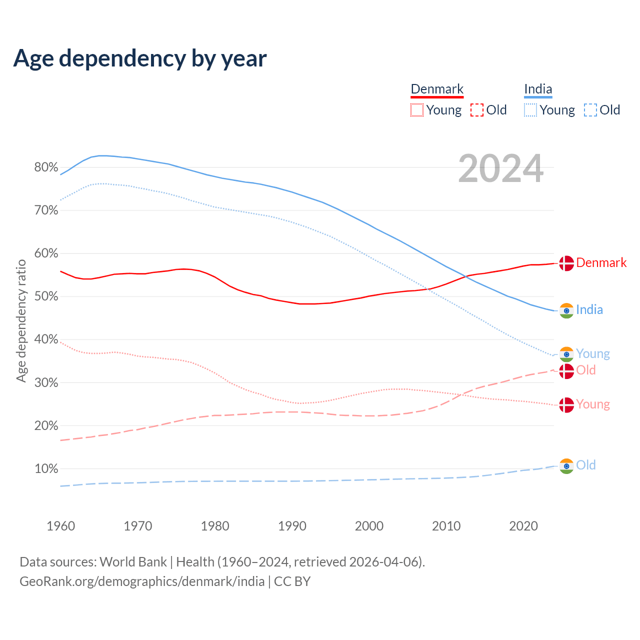- Denmark is ranked 34/196 by median age (oldest to youngest) vs 108/196 for India.