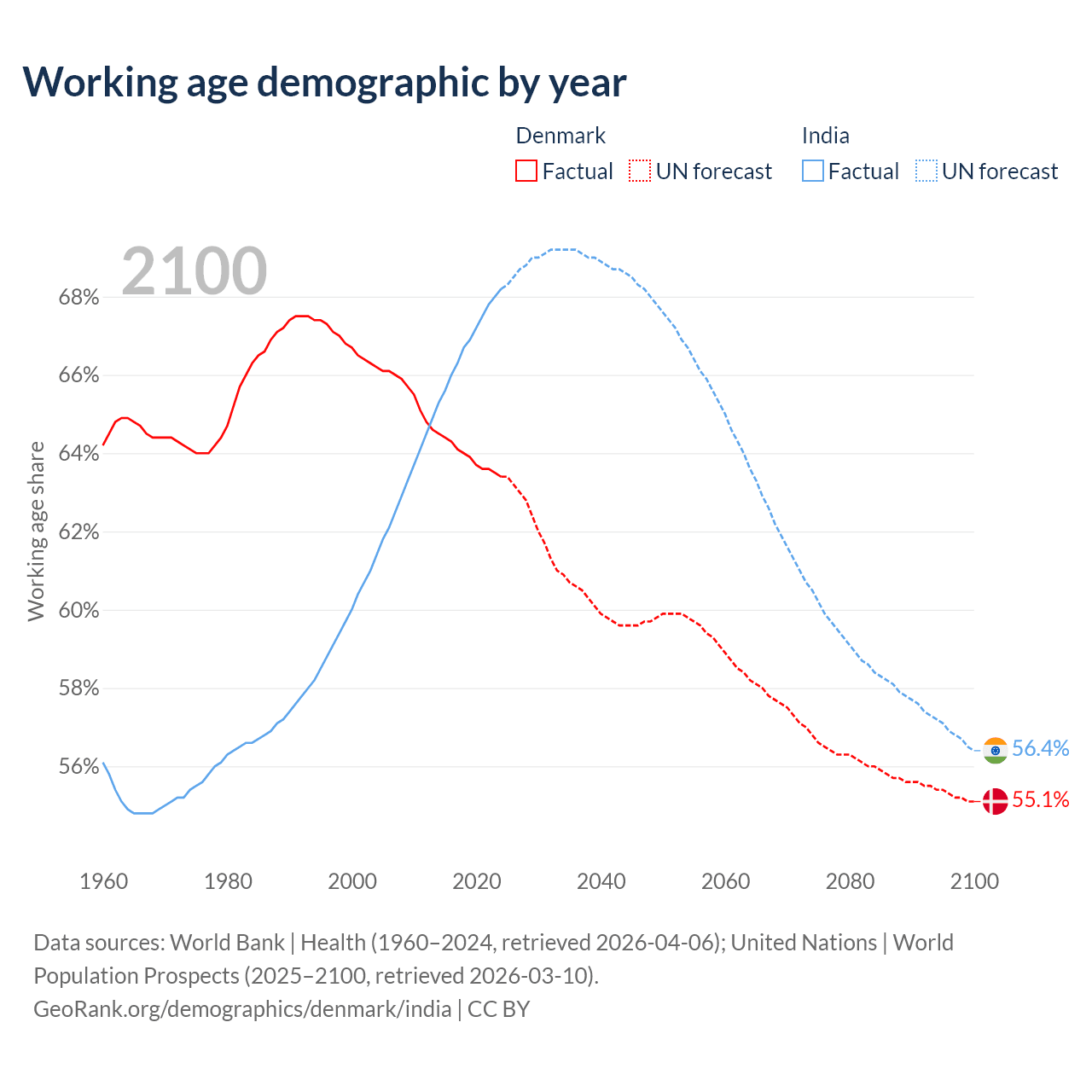 - Denmark has 3.83M working age adults (aged 15-64) vs 1.01B in India.