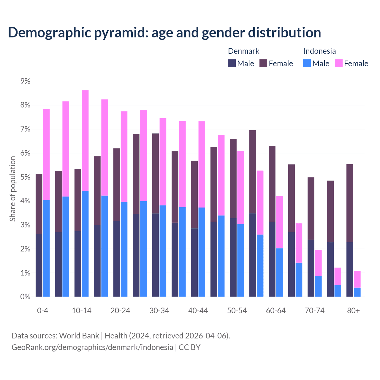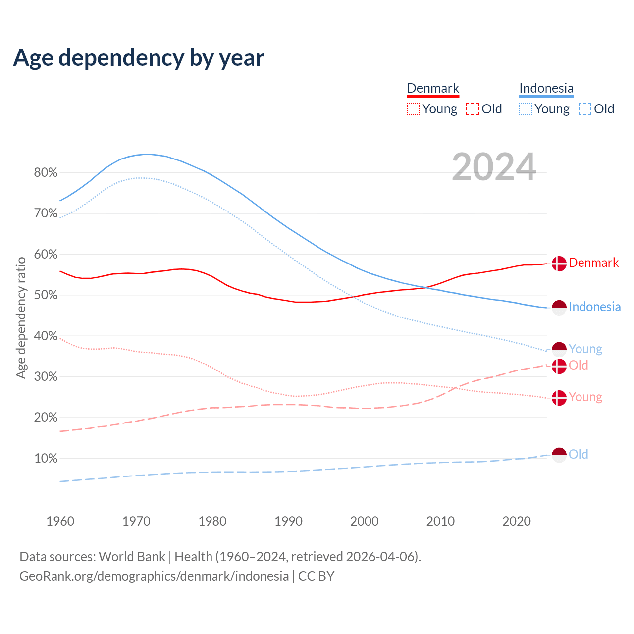 - Denmark is ranked 34/196 by median age (oldest to youngest) vs 93/196 for Indonesia.