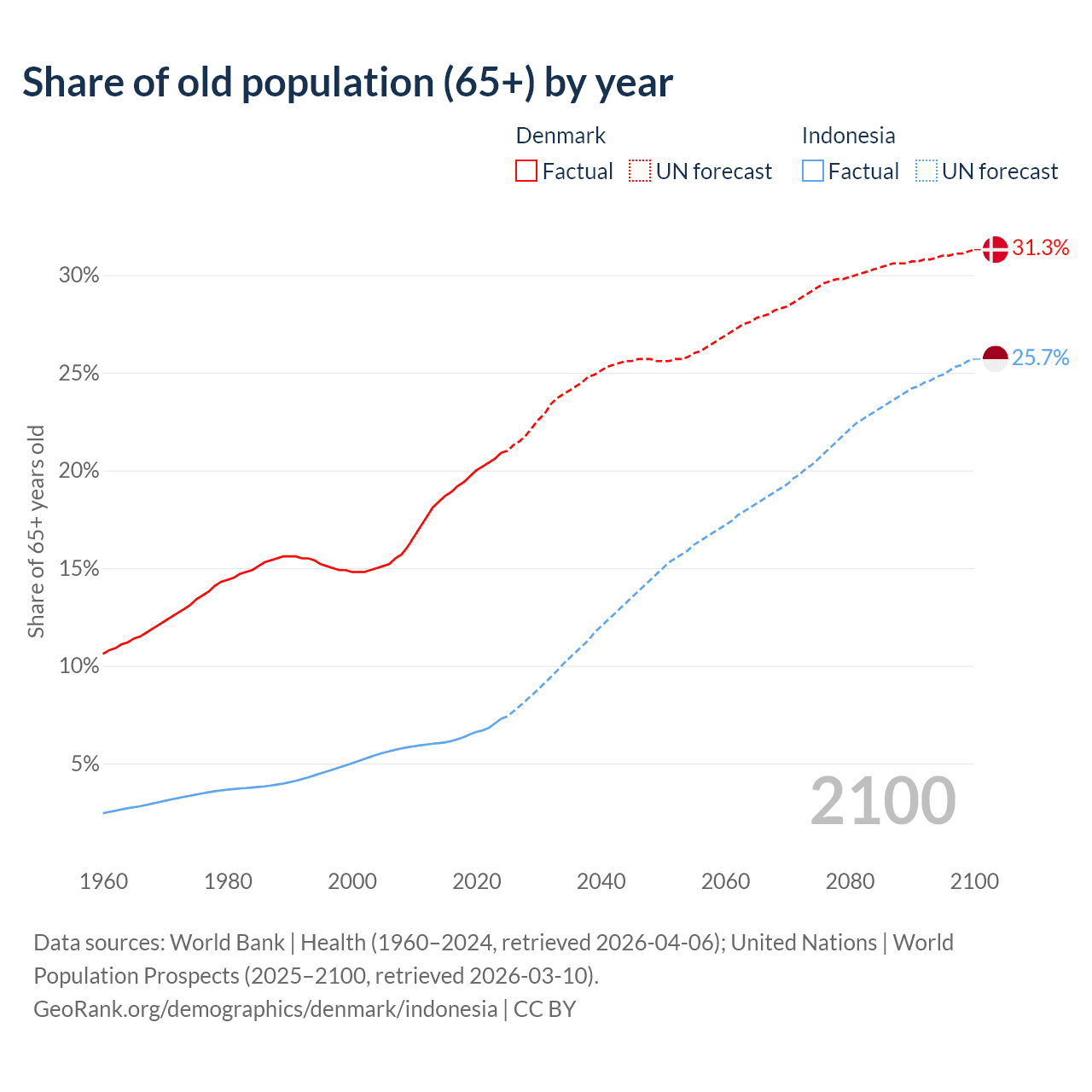 - The share of old-age demographic (65+) in Denmark is 20.9% vs 7.29% in Indonesia.