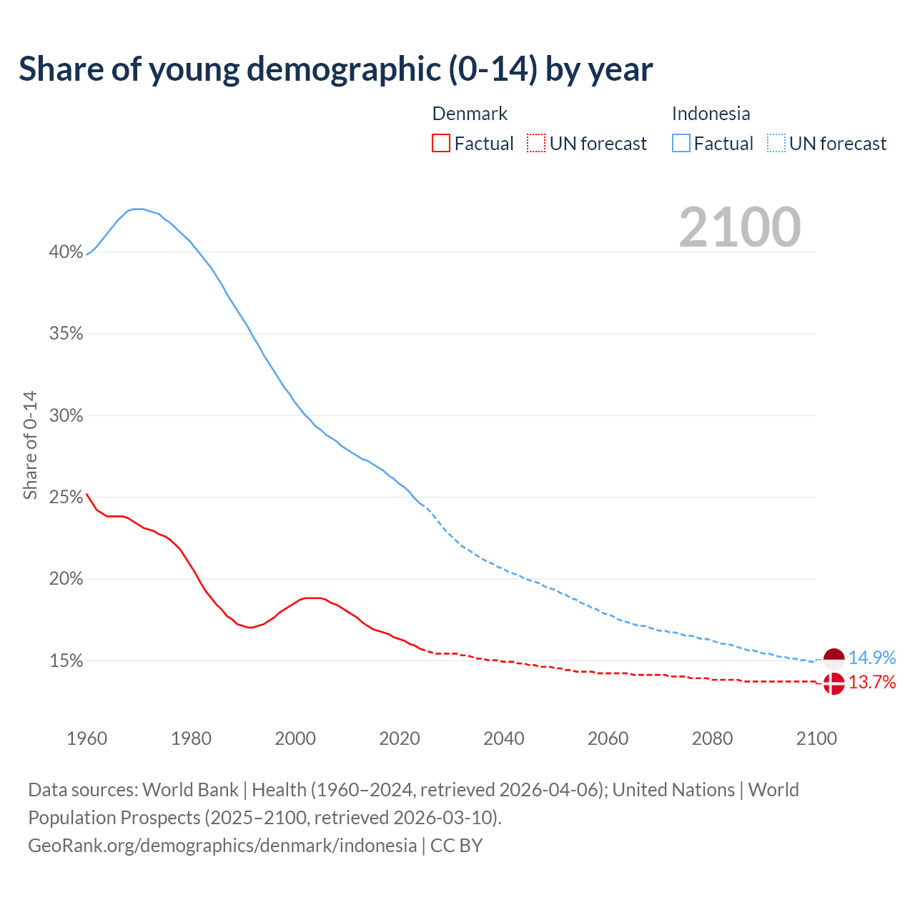 - The share of young demographic (0-15 years old) in Denmark is 15.7% vs 24.6% in Indonesia.